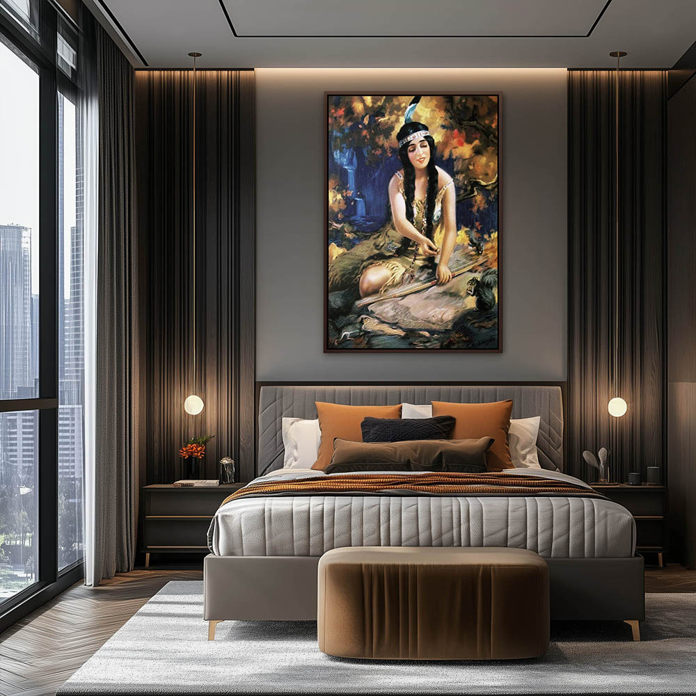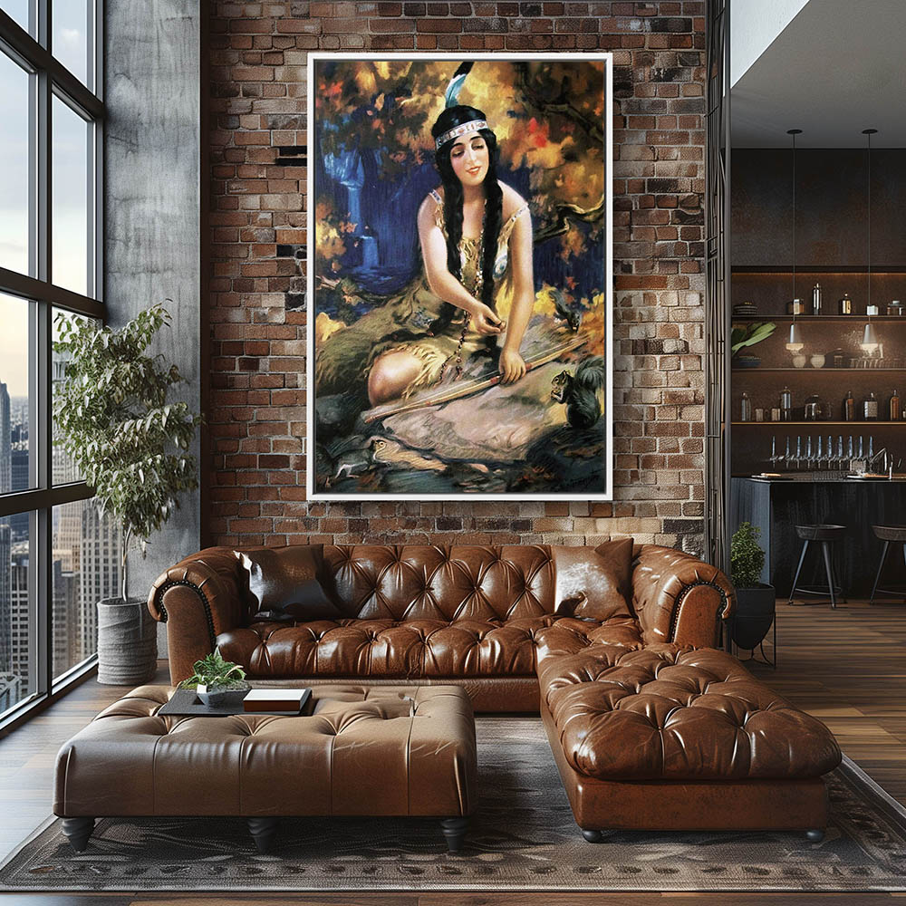 Figurative Painting of a Cherokee Indian Woman Feeding a Squirrel