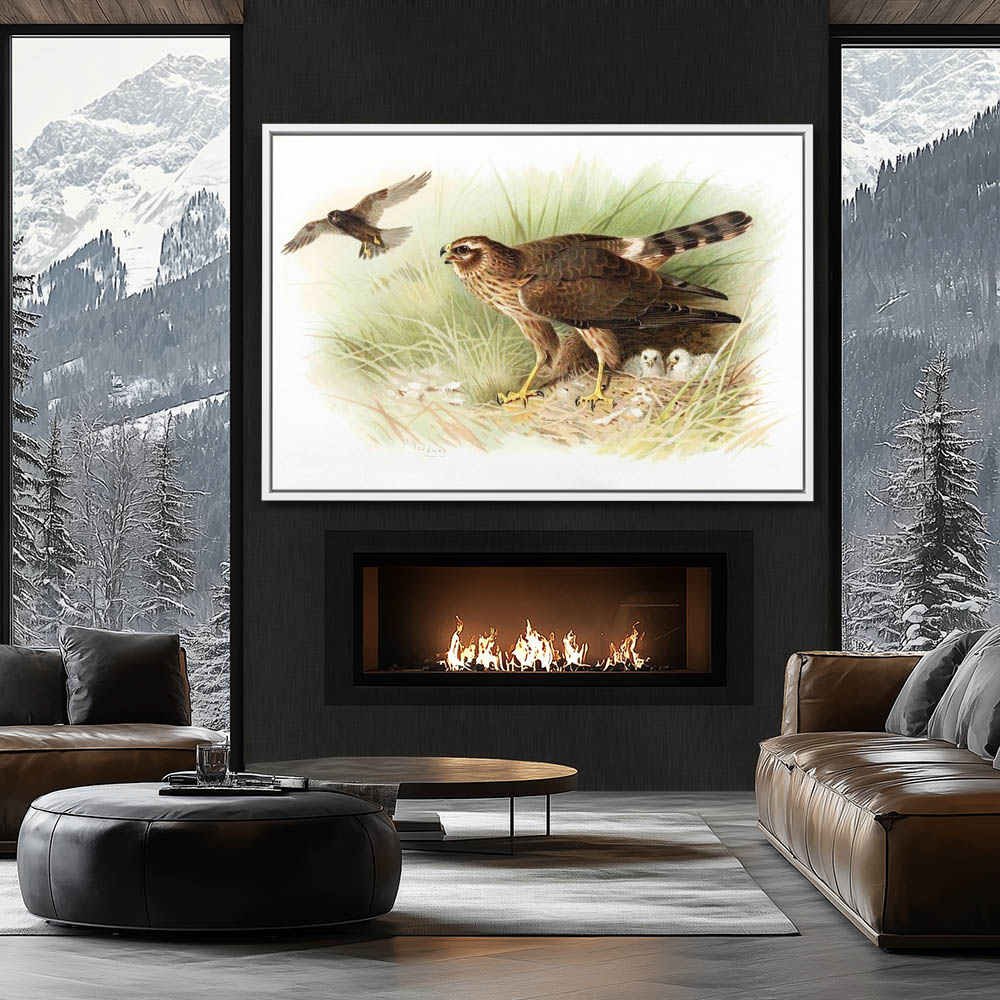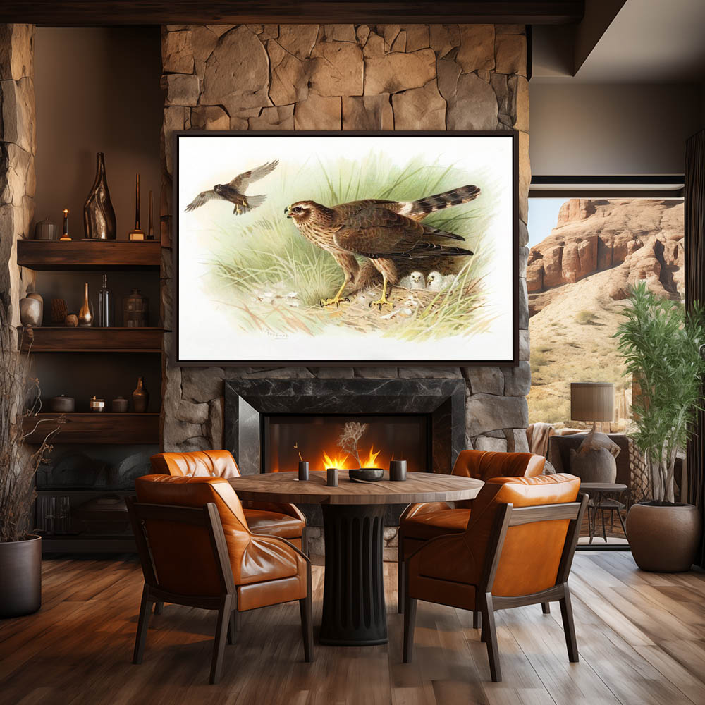 Painting of a Montagus Harrier Bird of Prey at the Nest with Chicks in the Grass
