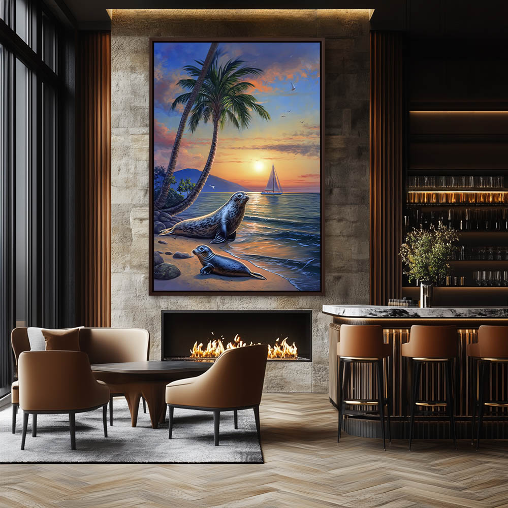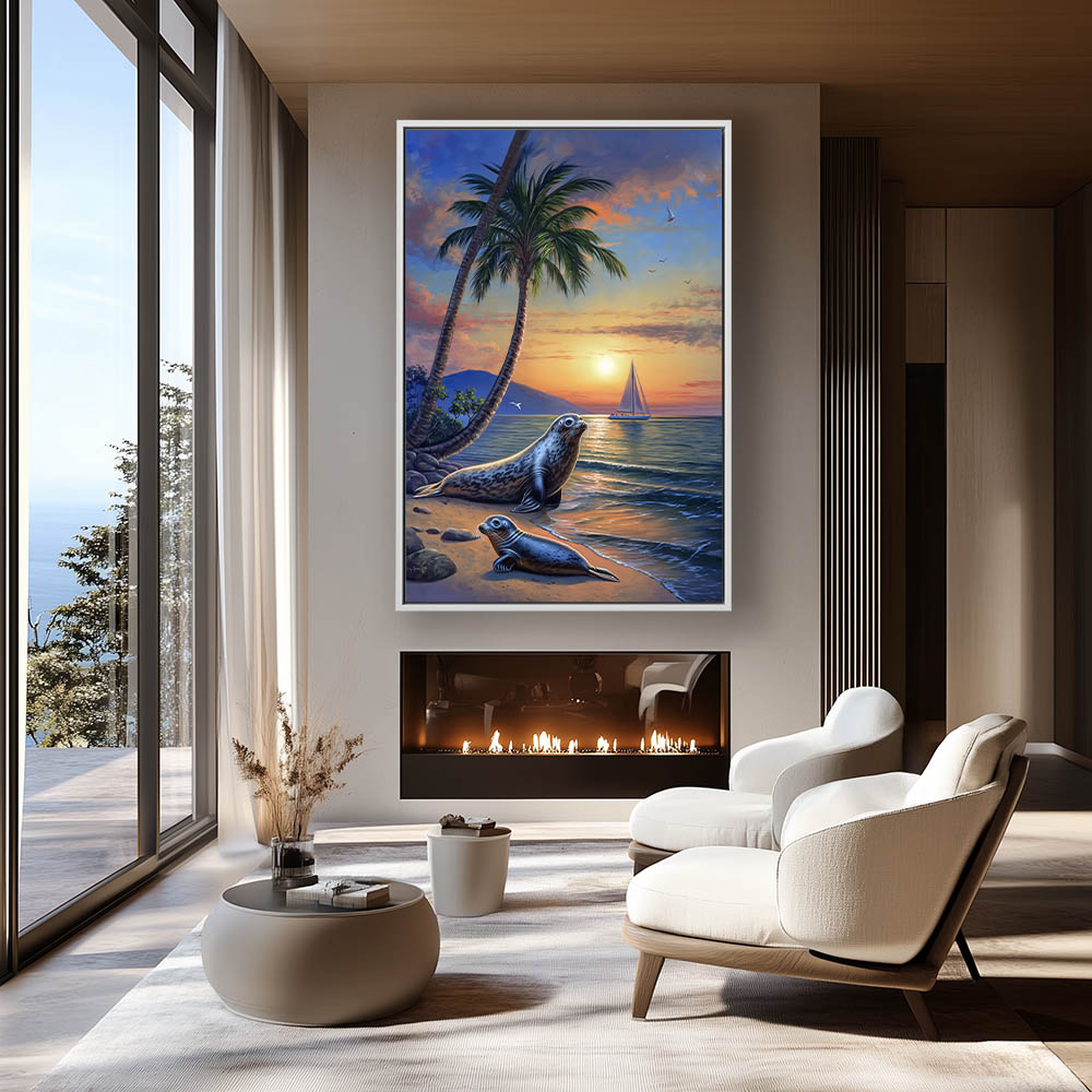 Coastal Beach Painting at Sunset with a Sailboat off Shore and Two Seals on the Beach