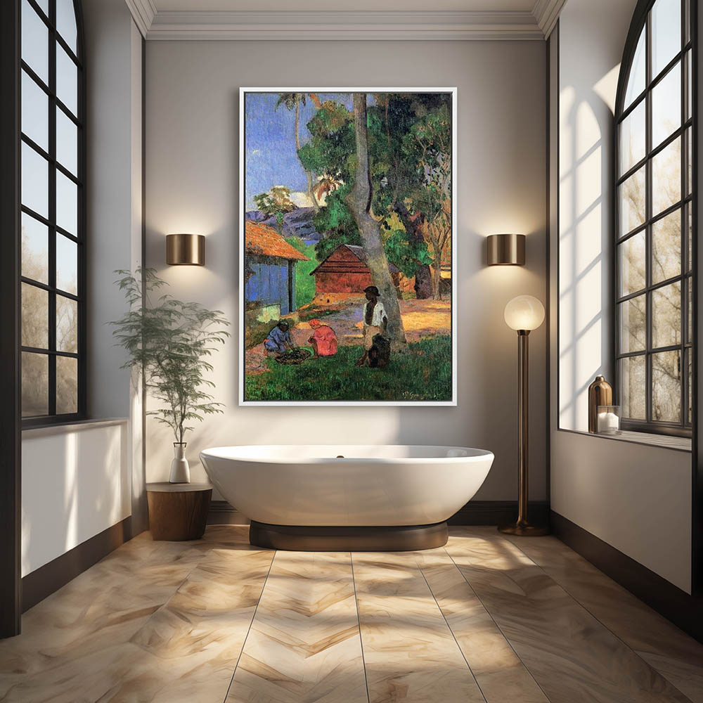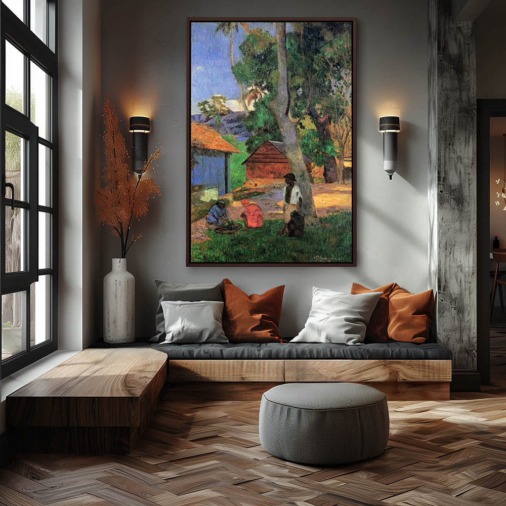Vintage Landscape Painting with Figures in Front of Huts