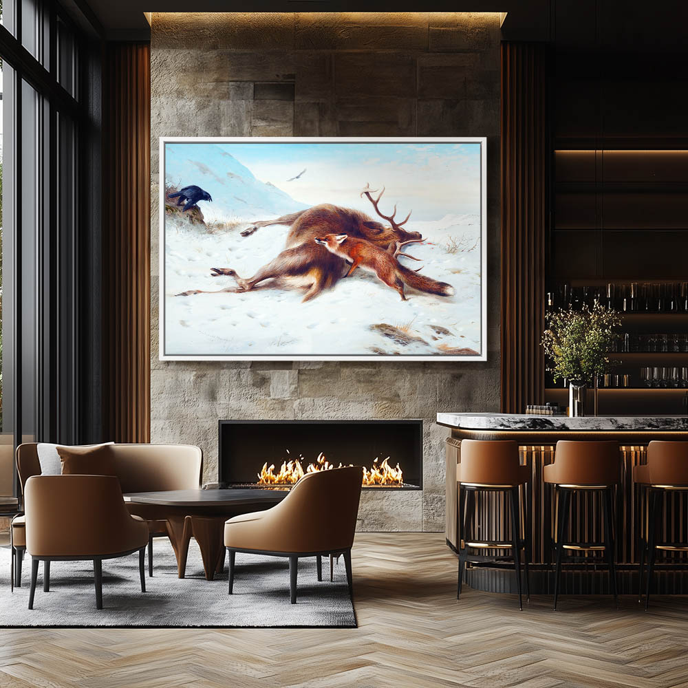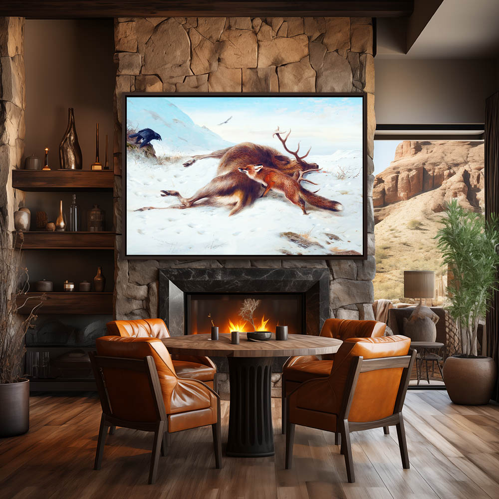 Painting of a Winter Standoff for a Deer by a Fox and a Raven