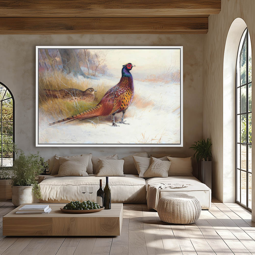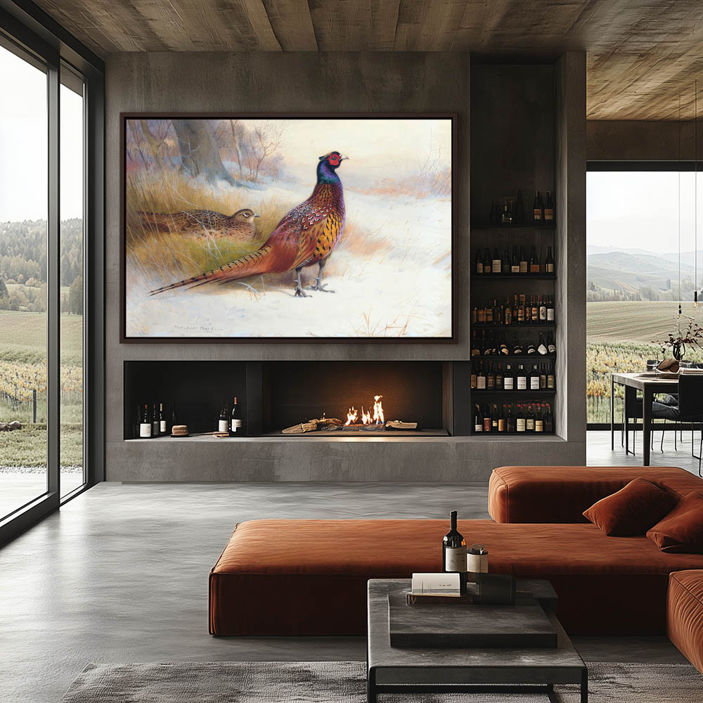 Painting of a Cock and Hen Pheasant in the Edge of the Woods in the Grass