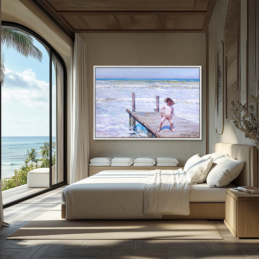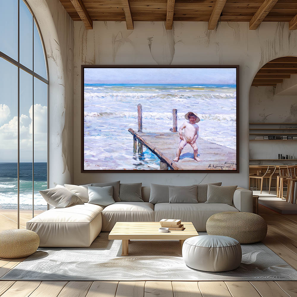 Coastal Painting with Waves and Young Naked Boy on the Pier