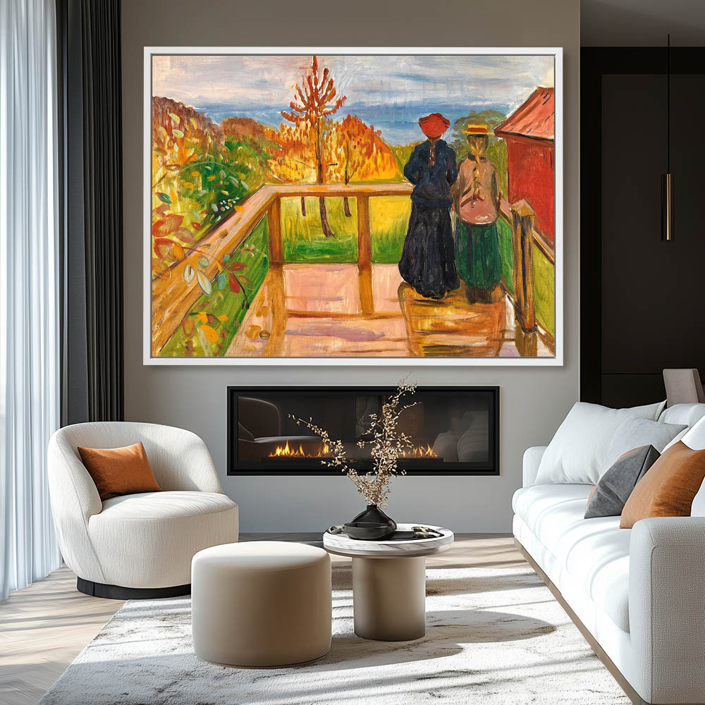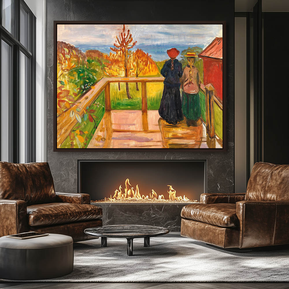 Two women with braids standing on a balcony in an Autumn landscape