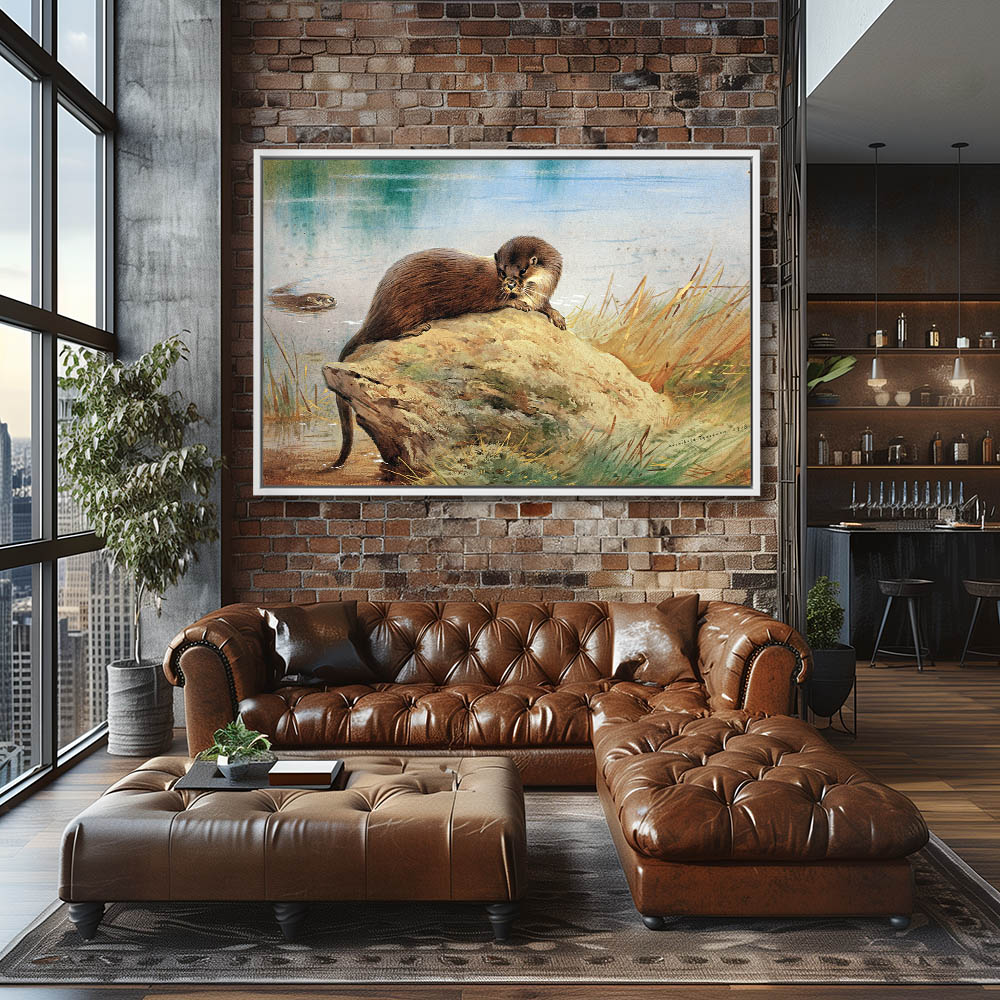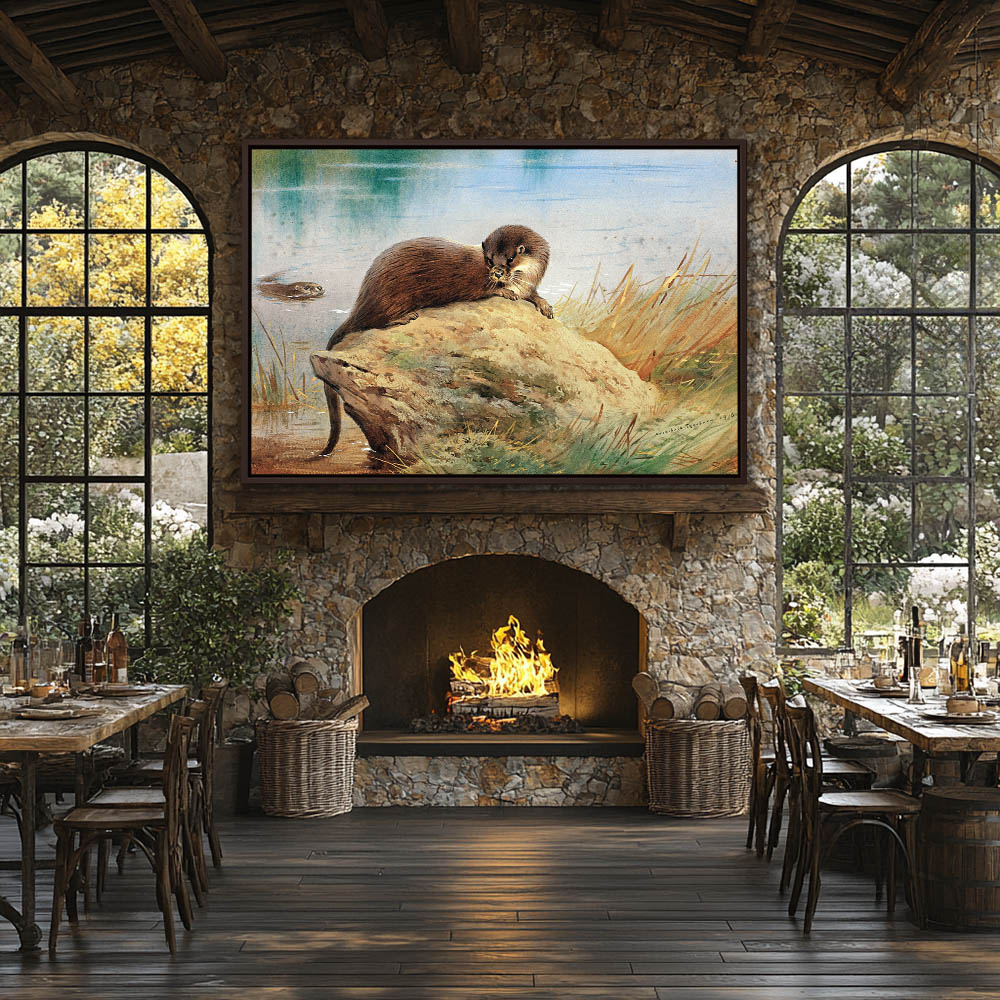 Painting of Otters on a Rock on the Bank and One Swimming in the Water