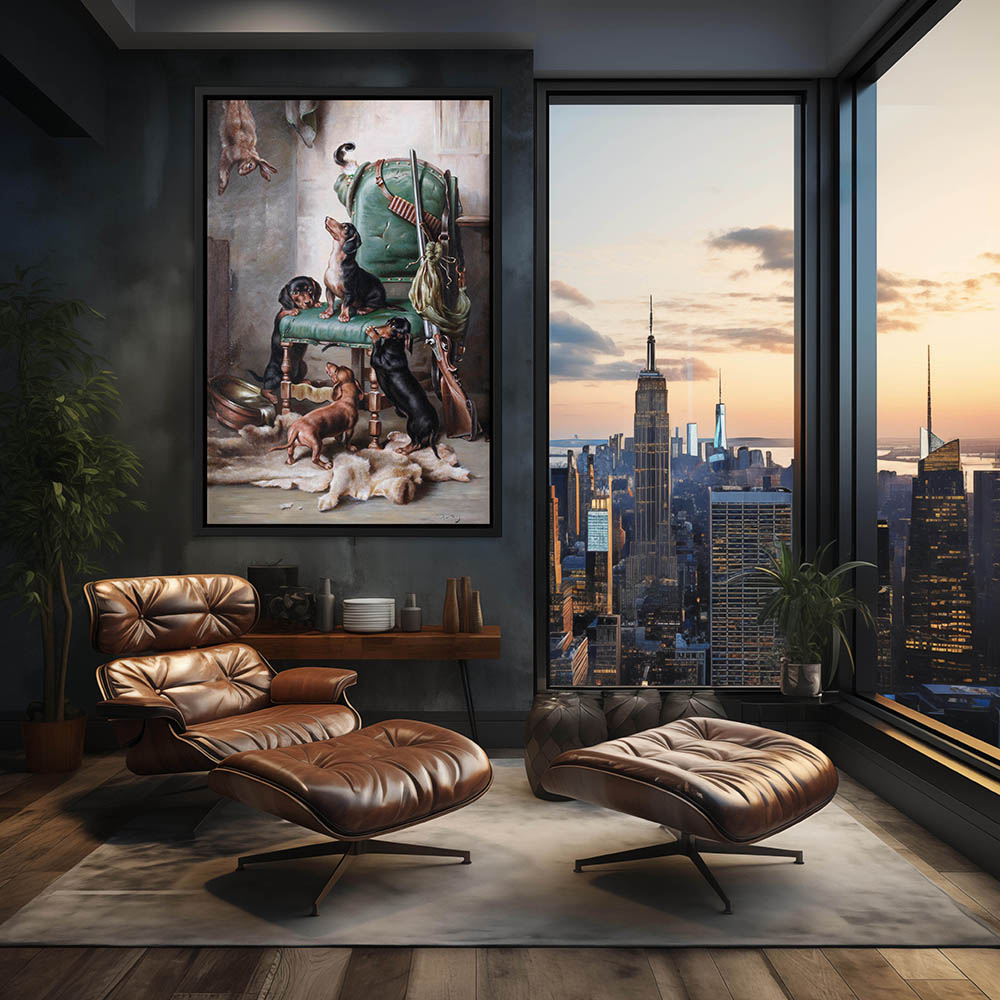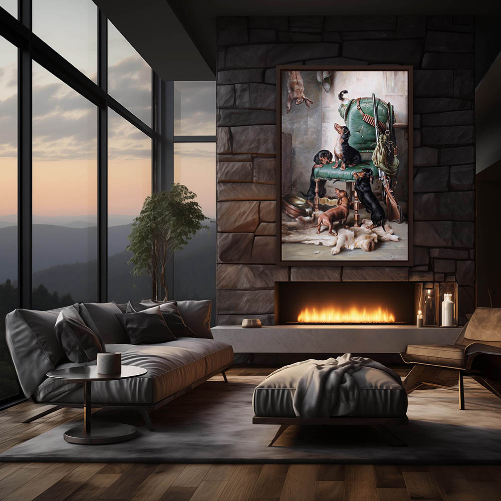 Four Dachshund puppies climbing among hunting gear after a rabbit