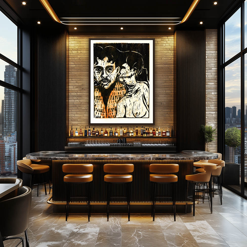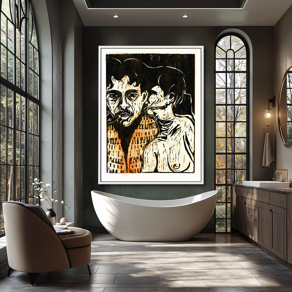 Print of a man smoking a pipe and a woman with her face turned into his neck