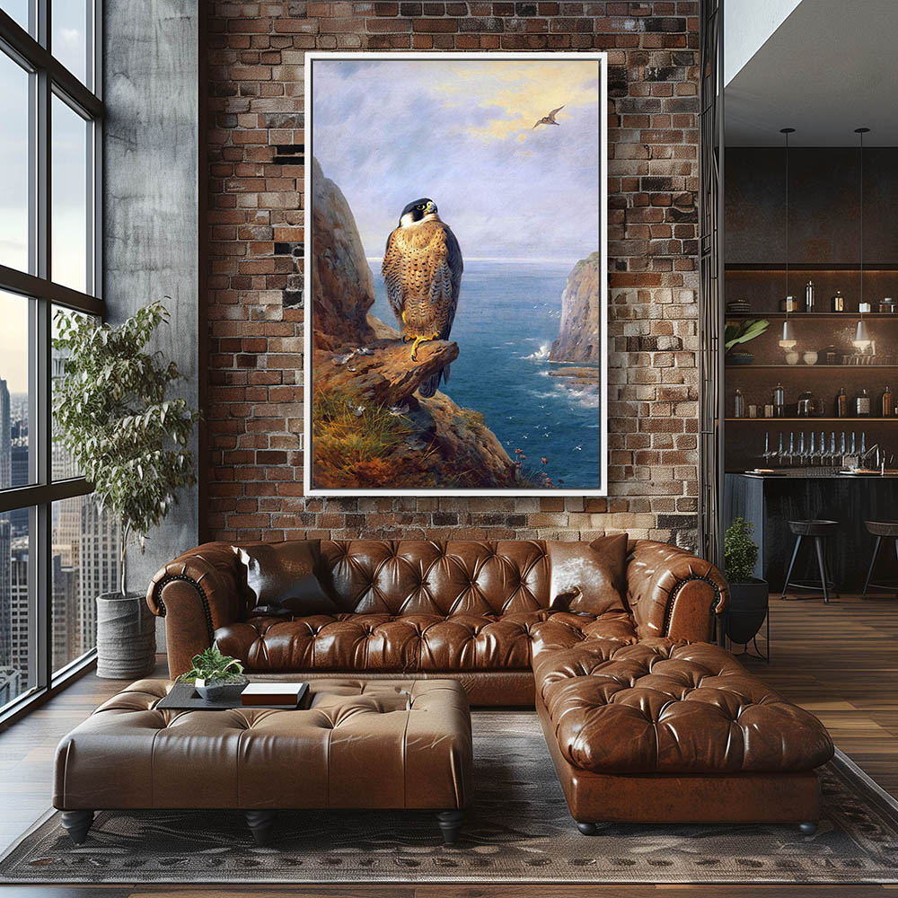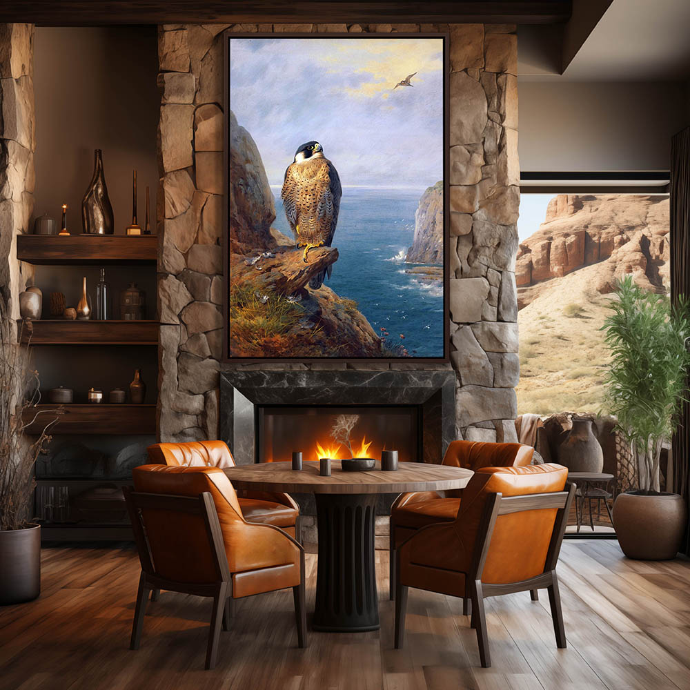Painting of a Peregrine Falcon Bird of Prey Perched on a Rock Overlooking the Sea