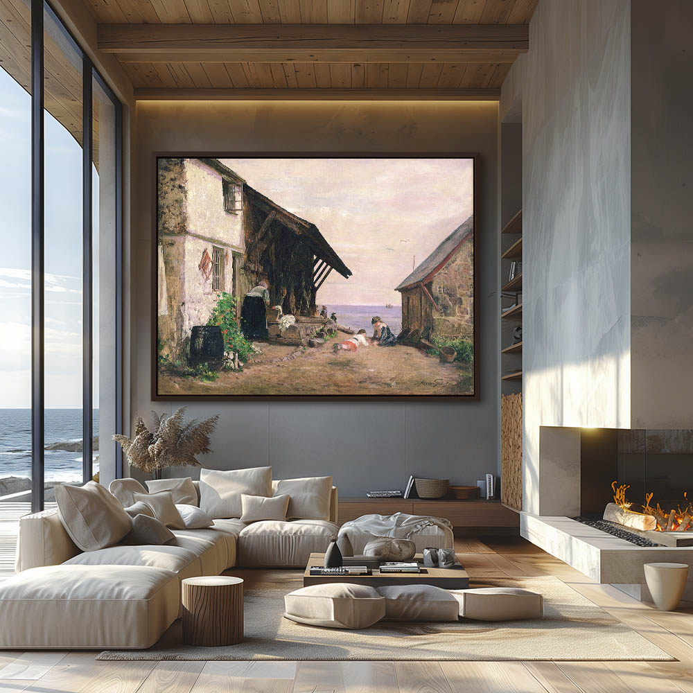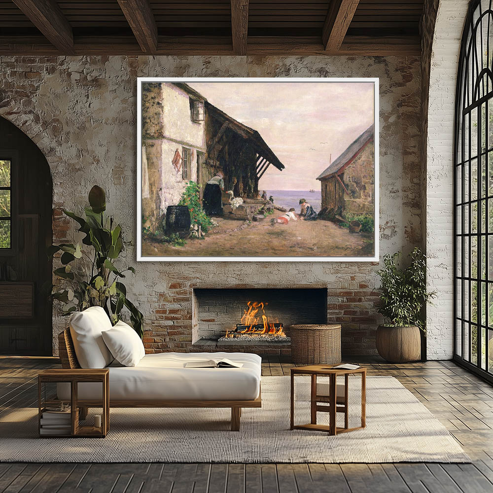 Vintage Landscape Coastal Paintiung with Kids Playing in Front of the House