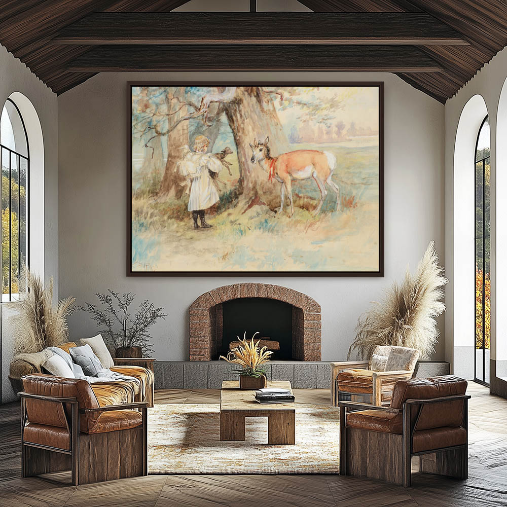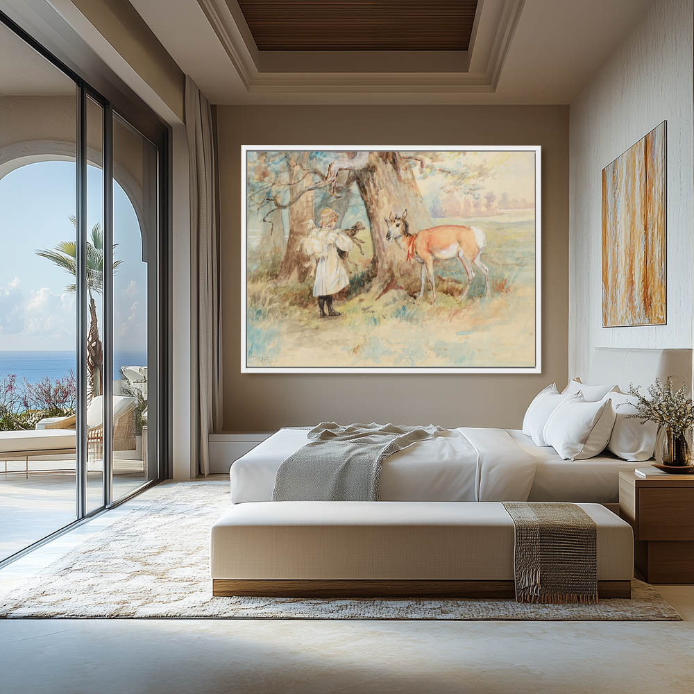 Little girl in white with two lambs and a deer