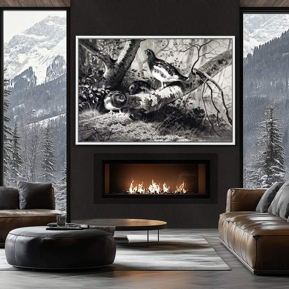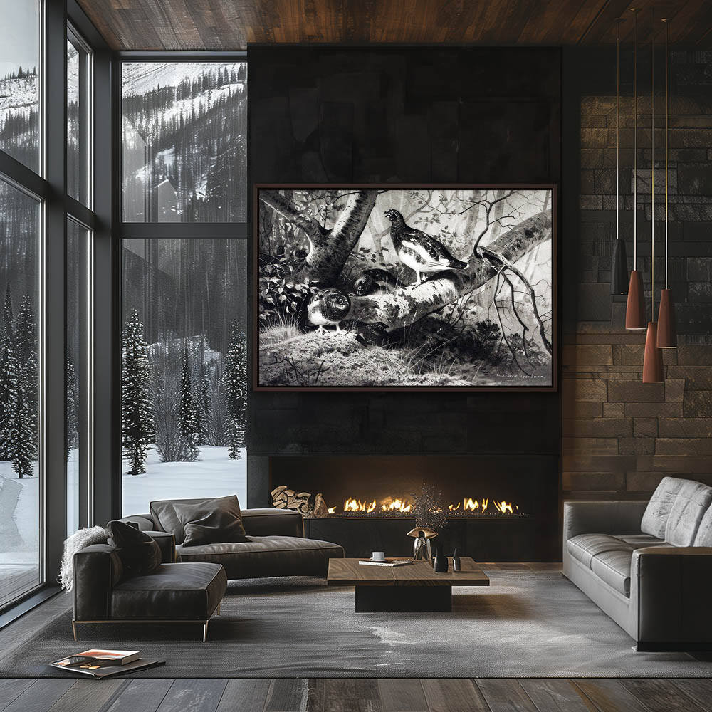 Painting Ptarmigan Gamebirds in the Woods on a Limb in Black and White