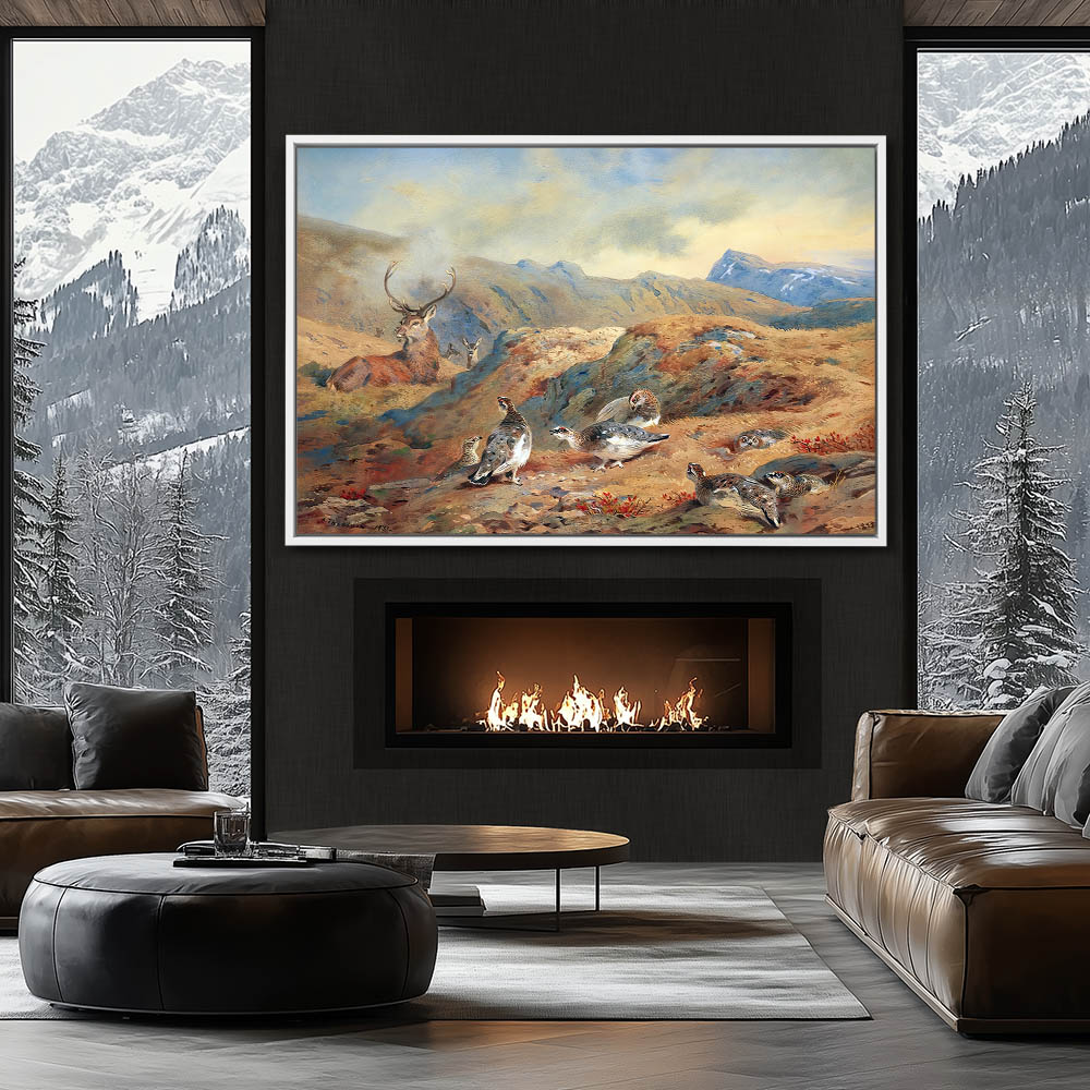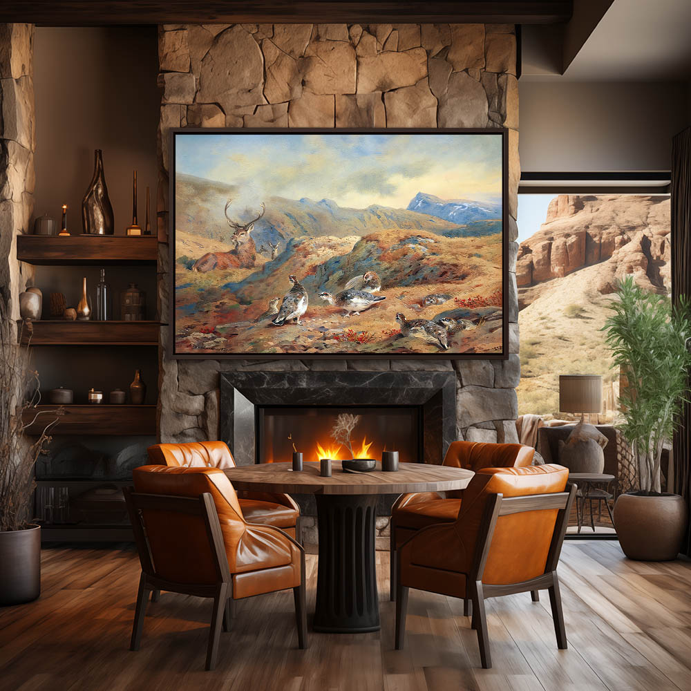Mountainous Open Landscape Painting with Deer and Game Birds
