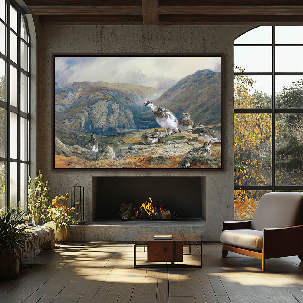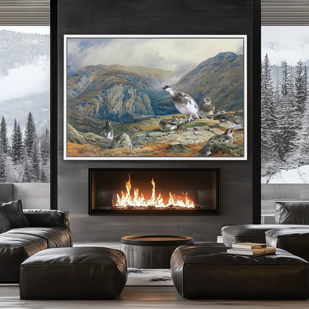 Mountainous Landscape Painting with Gamebirds Resting on a Rock