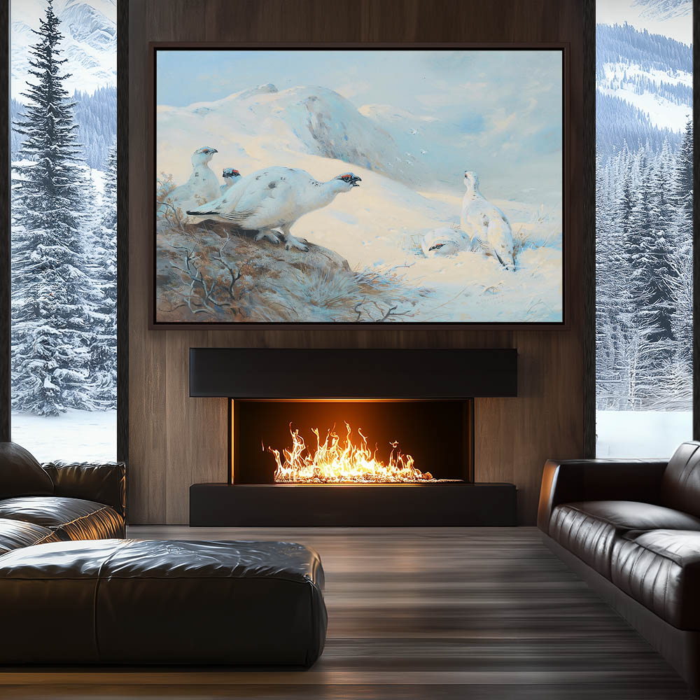 Snowy Mountainous Landscape Painting with Ptarmigan Gamebirds