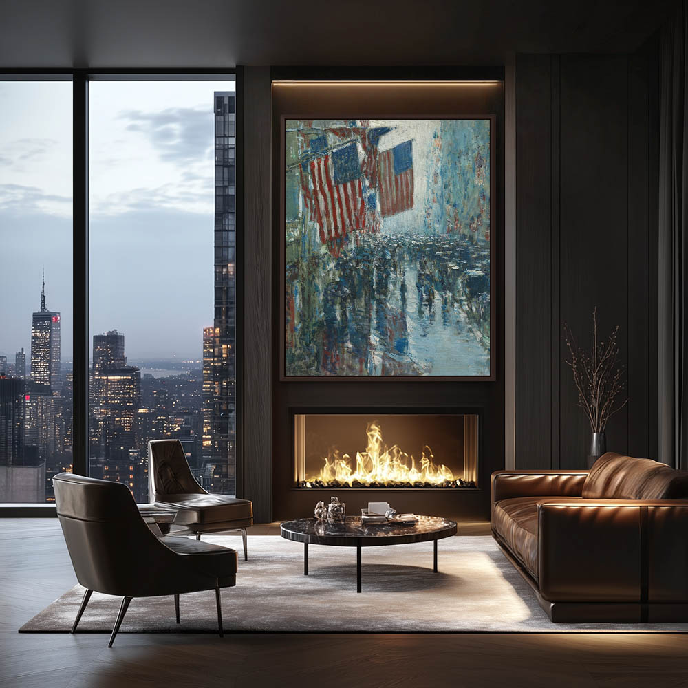 Rainy day on a flag lined 5th Avenue