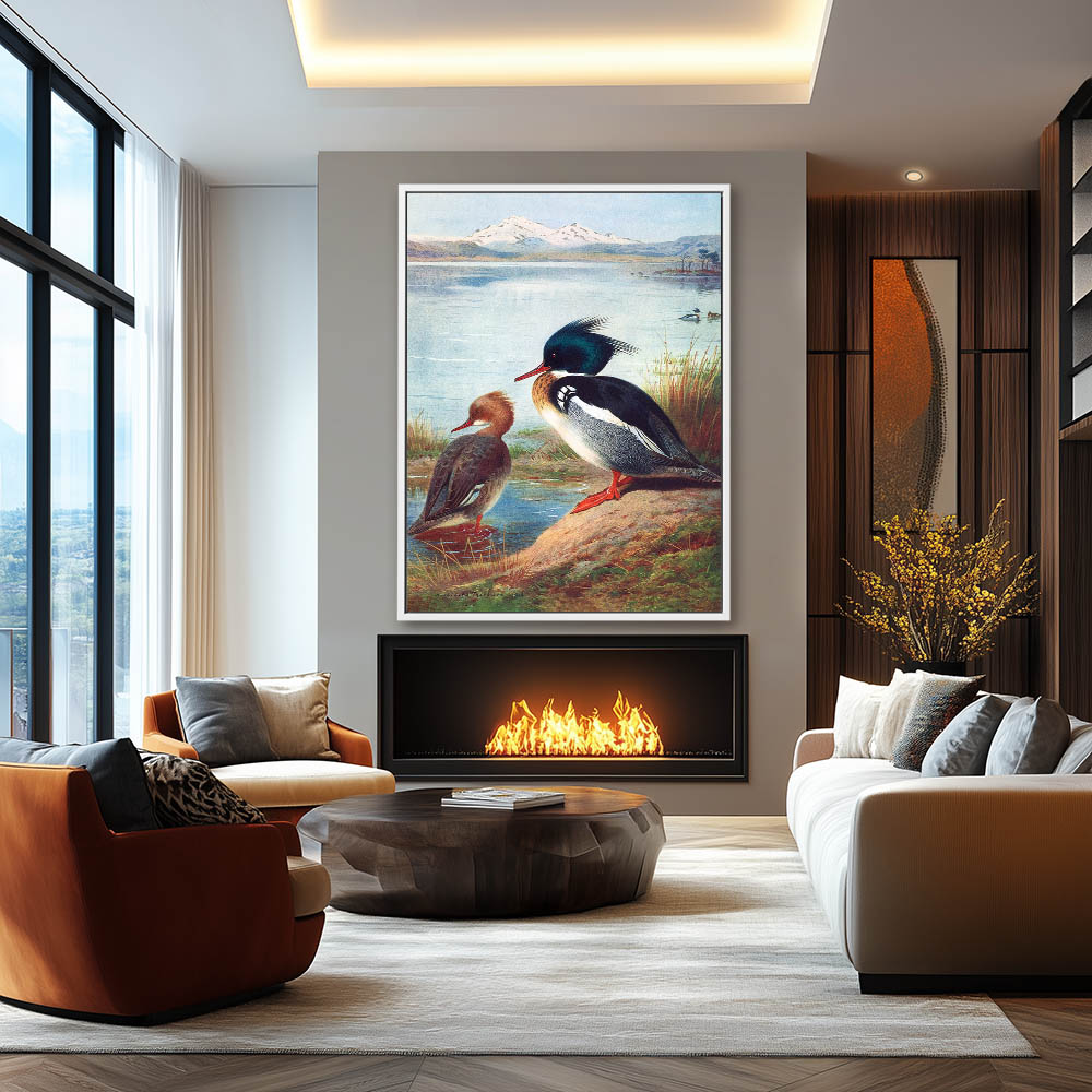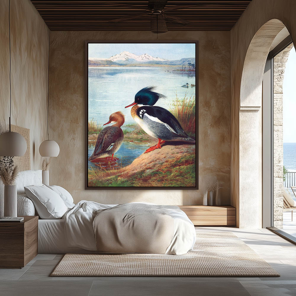 Lake Landscape Painting with Ducks on Shore and in the Water