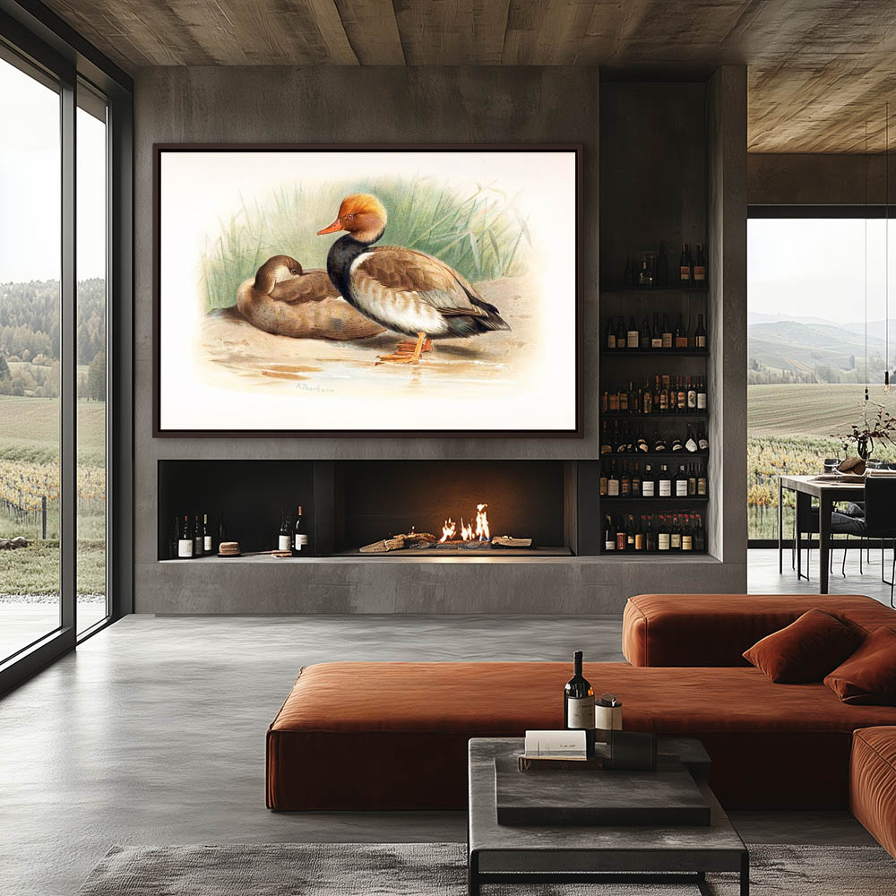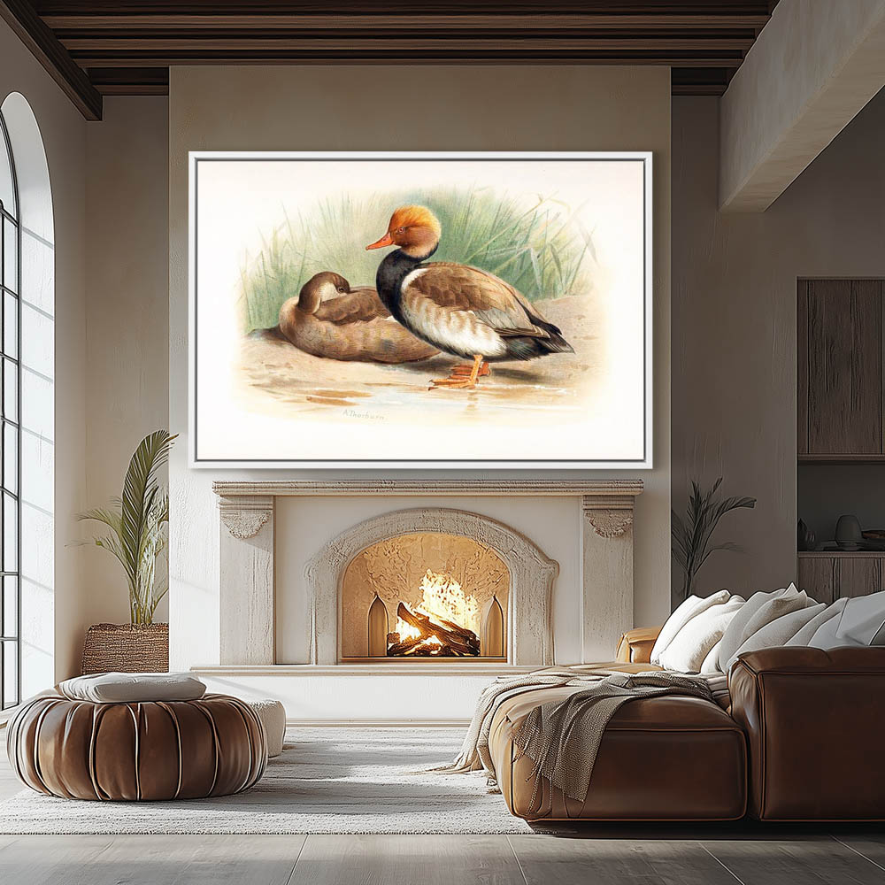 Painting of Red Crested Pochard Ducks on the Shore by the Edge of the Water