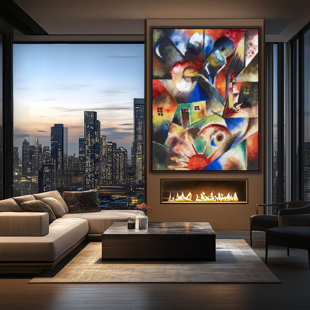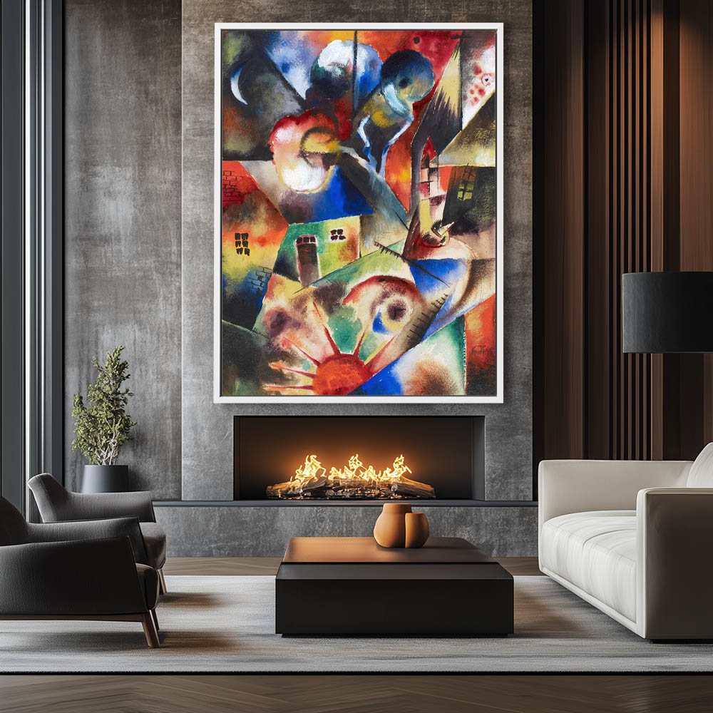 Abstract cubist painting of Red Sun and Houses