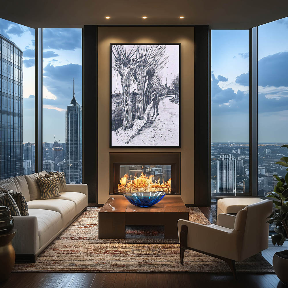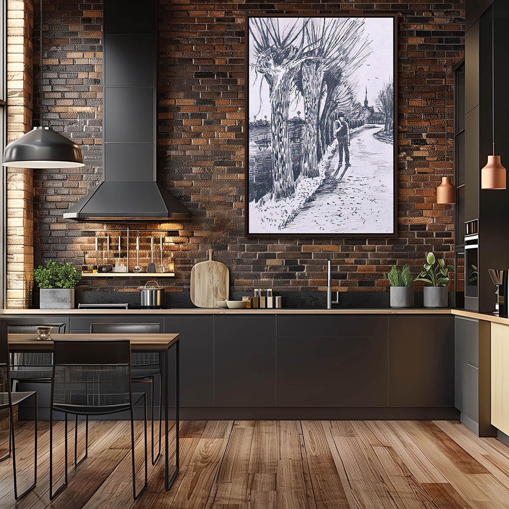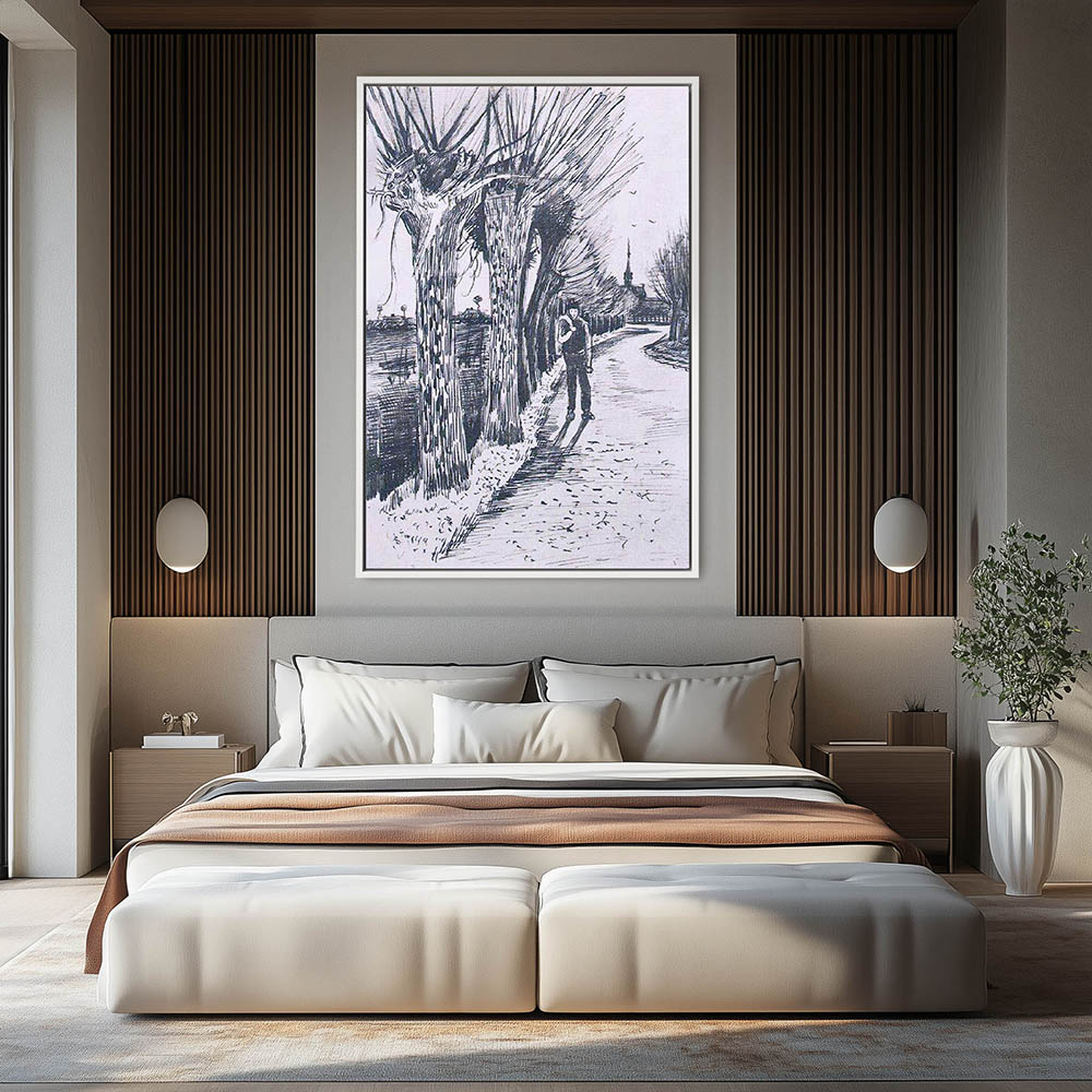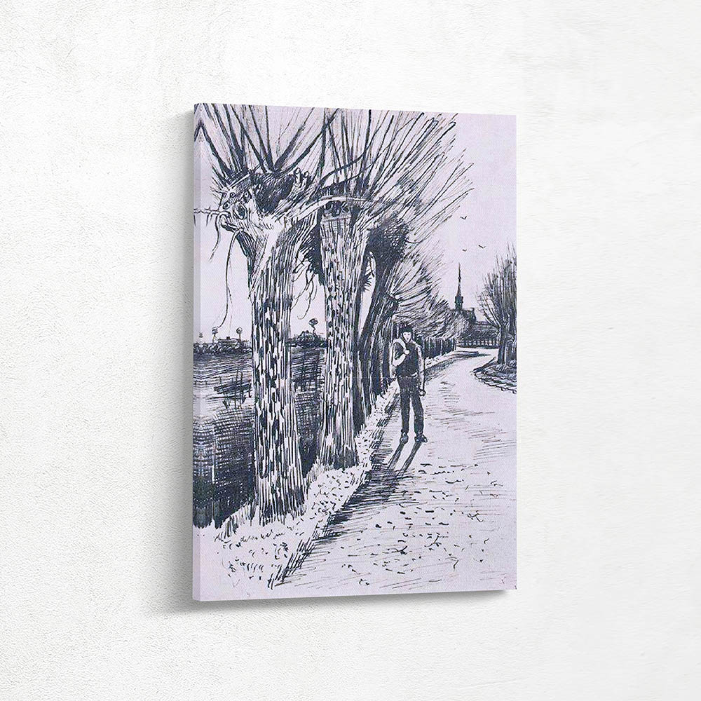 Impressionist Figurative Drawing of a Man Walking a Path Lined with Pollard Willows