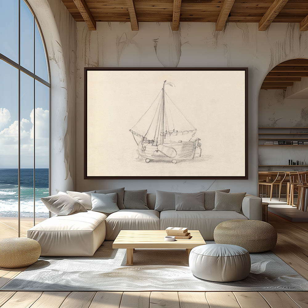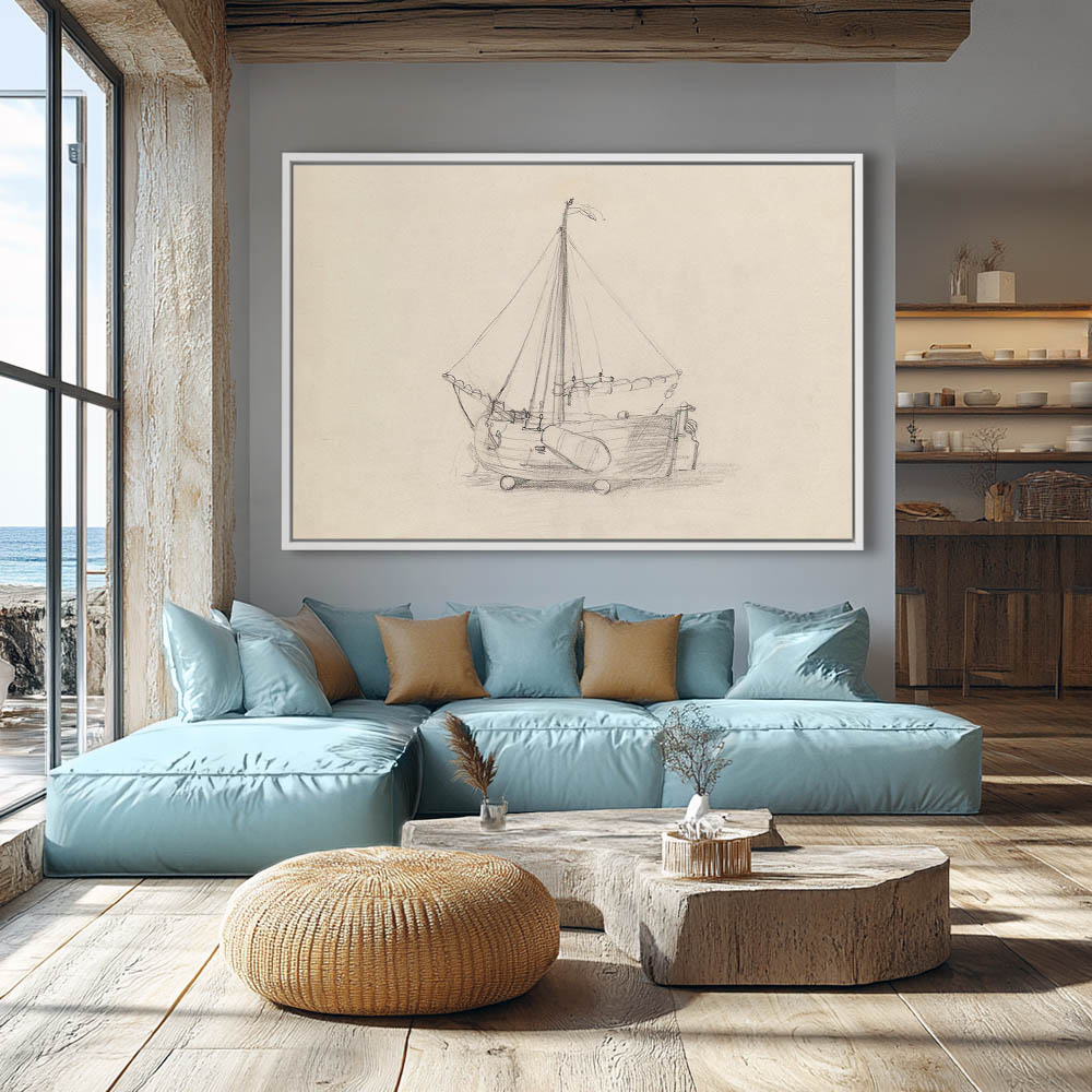 Sketch of a sailboat on land, anchor drawn in and sails furled