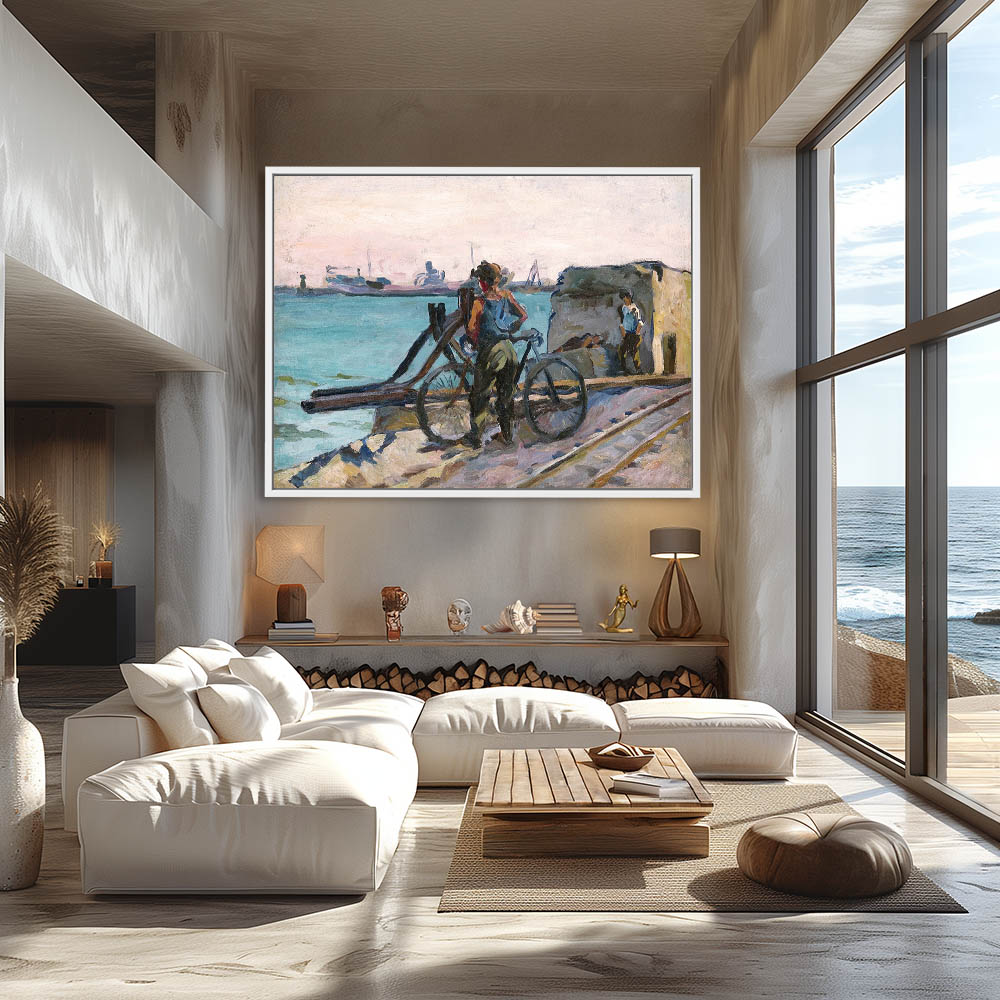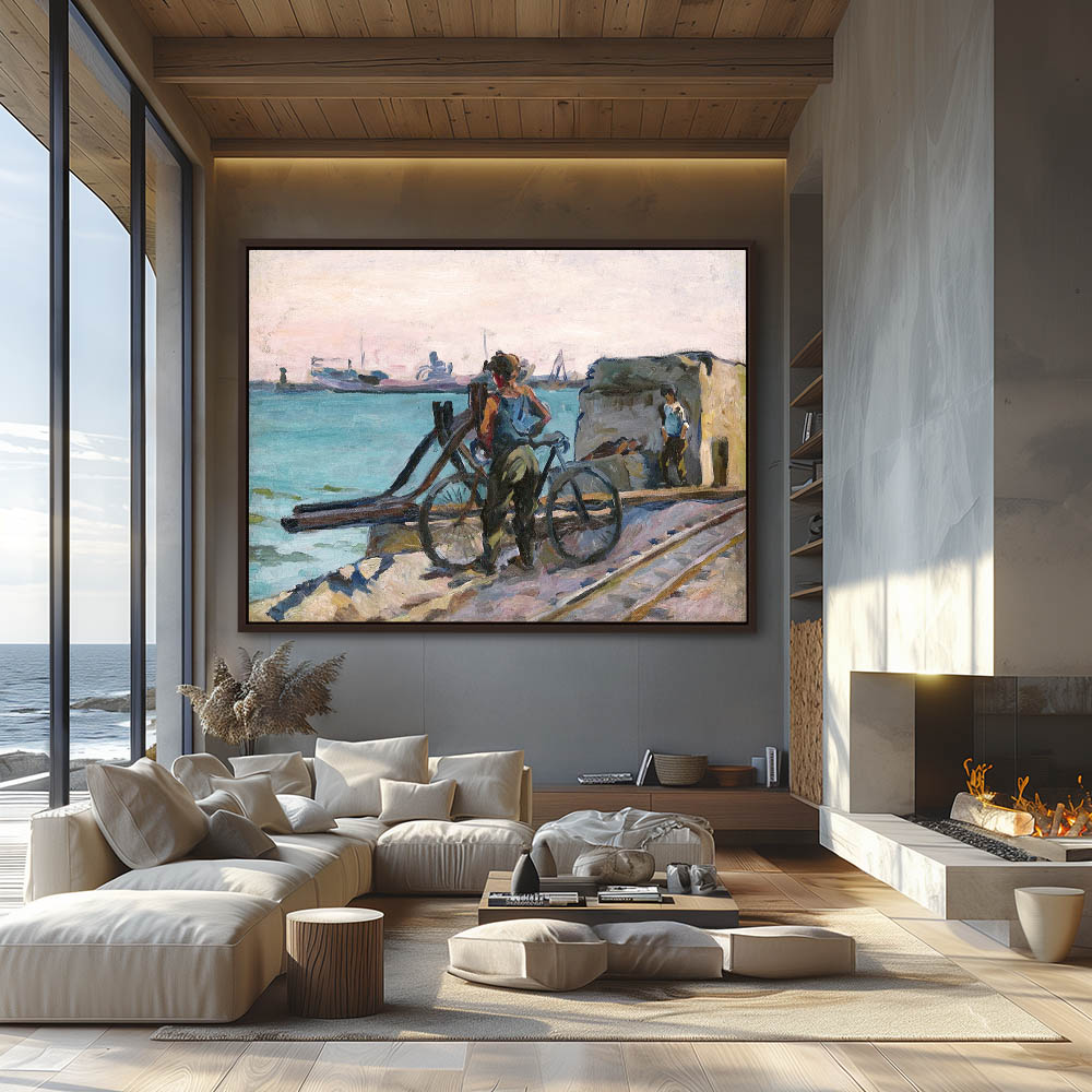 Abstract Coastal Painting with a Figure on a Pier with a Bike watching the Ships at Sea