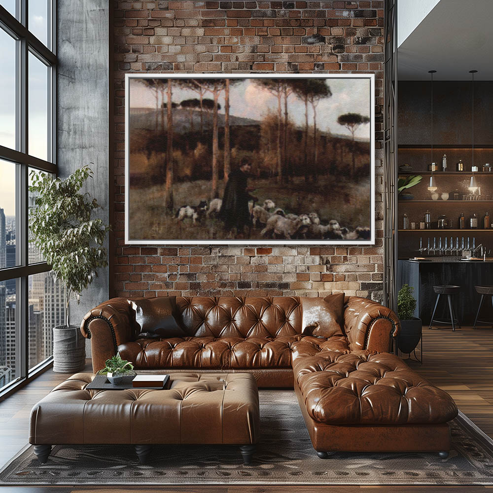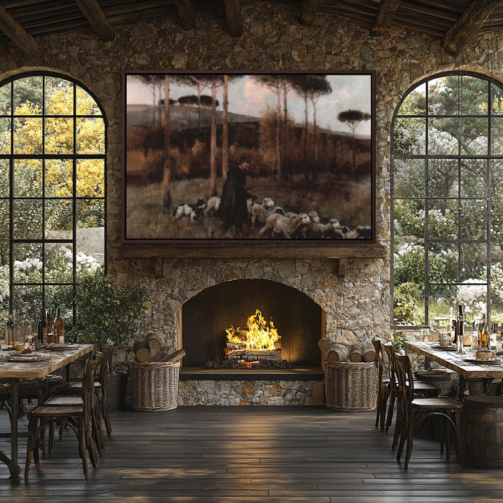 Vintage Painting of a Shepherd and Sheep in a Landscape at Sunset