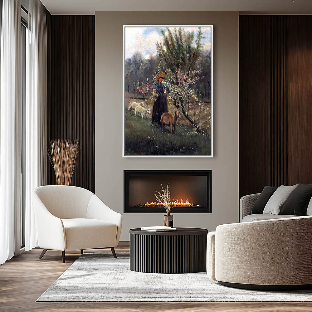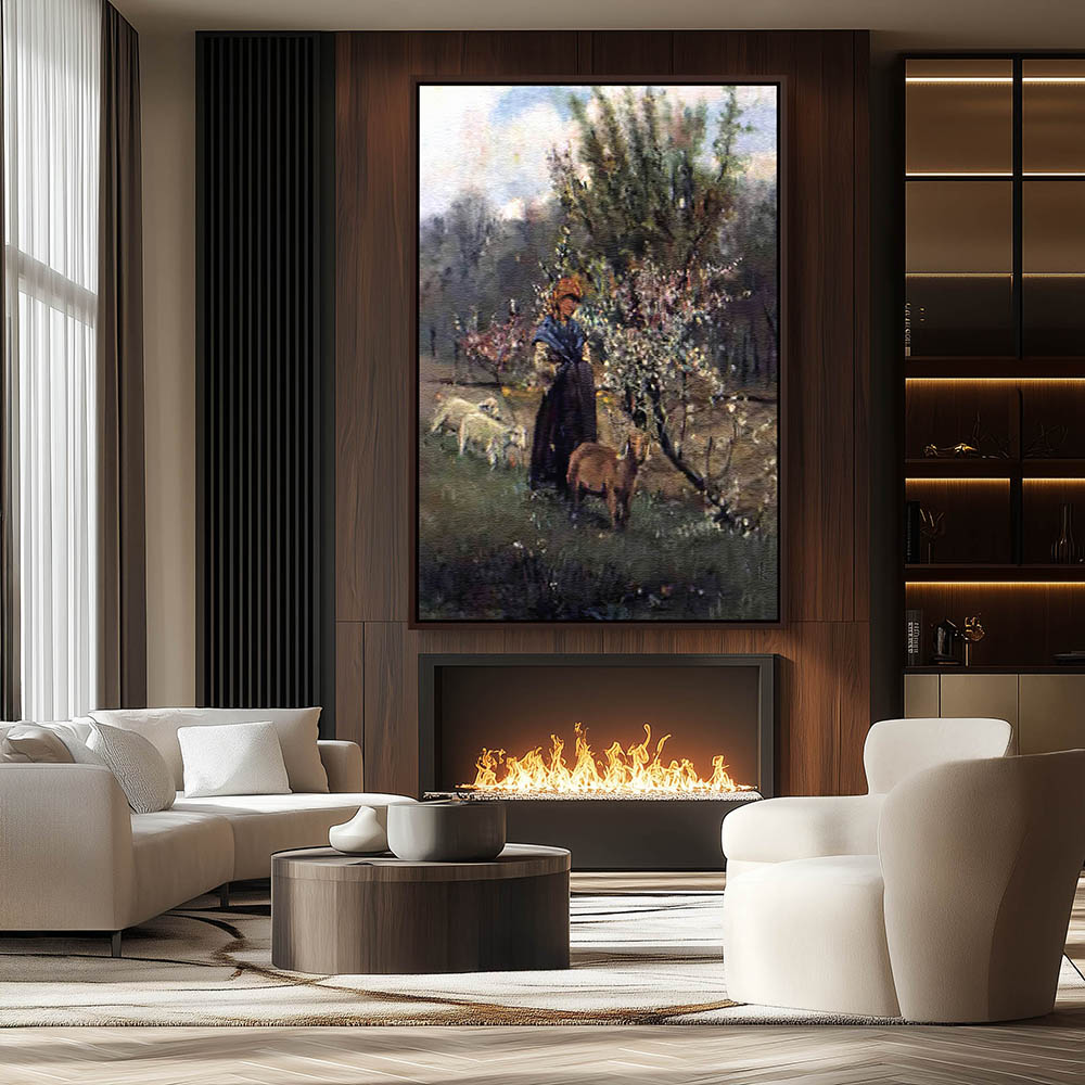 Vintage Painting with a Shepherdess on a Farm with Sheep