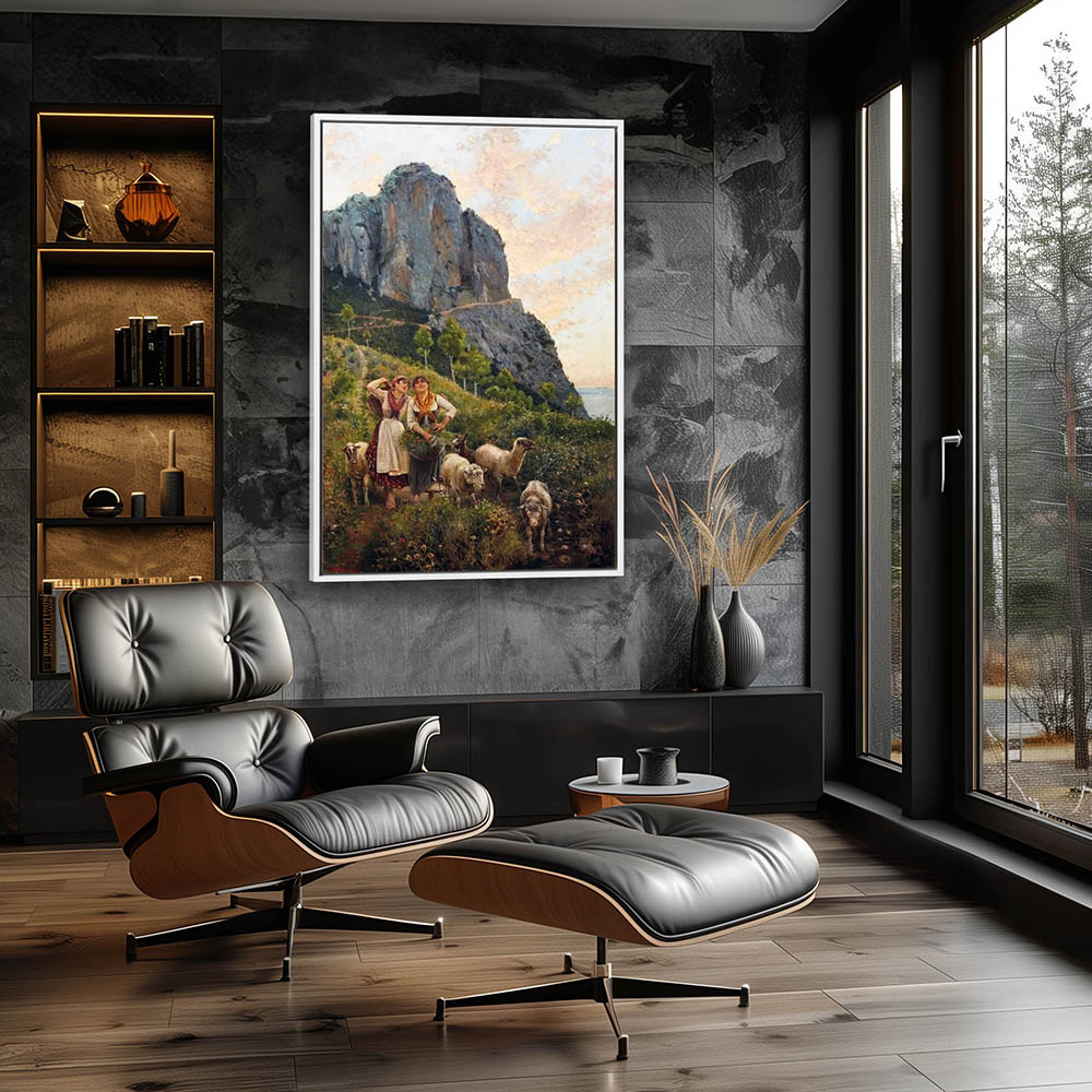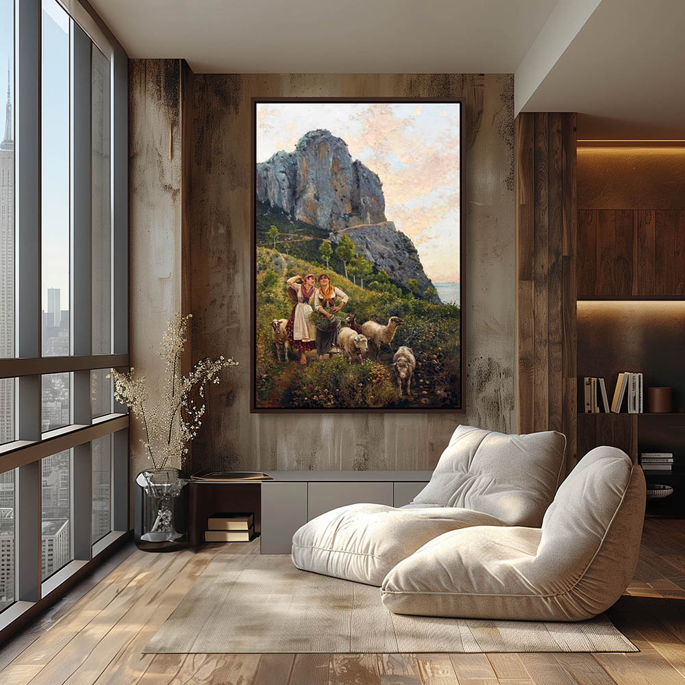 Painting of Two Female Figures with a Flock of Sheep on the Sea Shore Path
