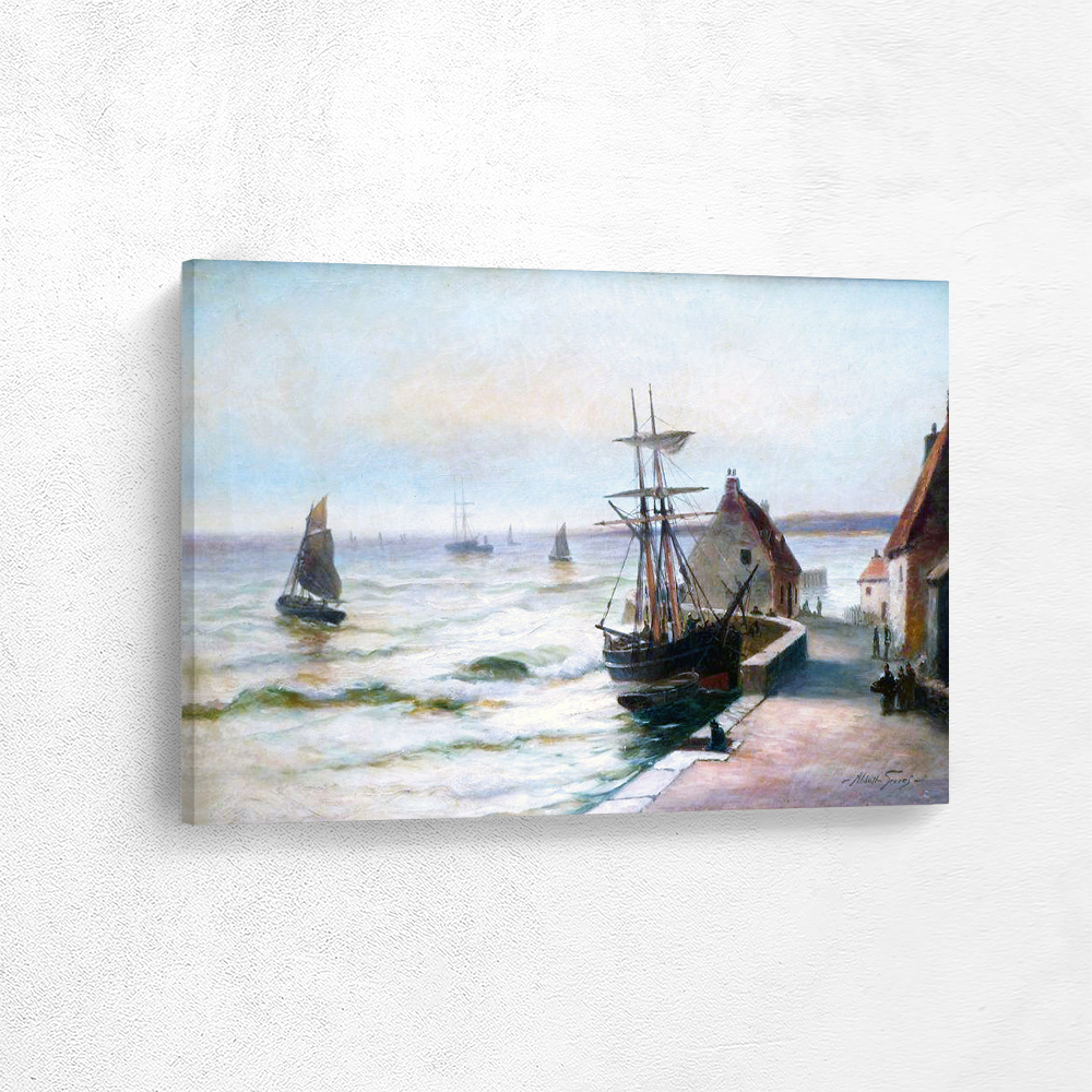 Vintage Harbor Sea Scape Painting with Sailboats at Sea