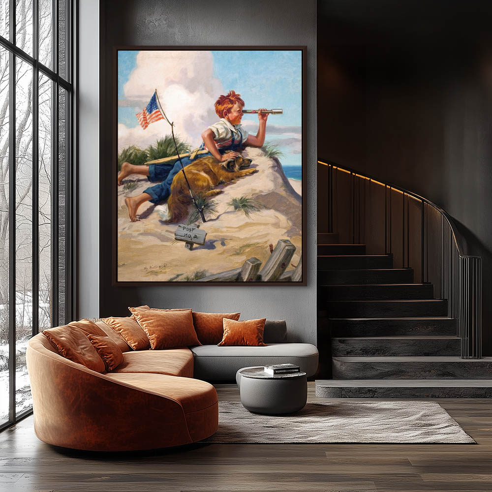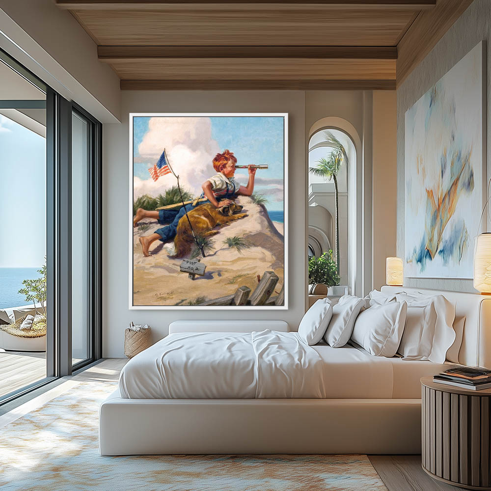 Figurative Painting of a Boy and His Dog on Shore Patrol