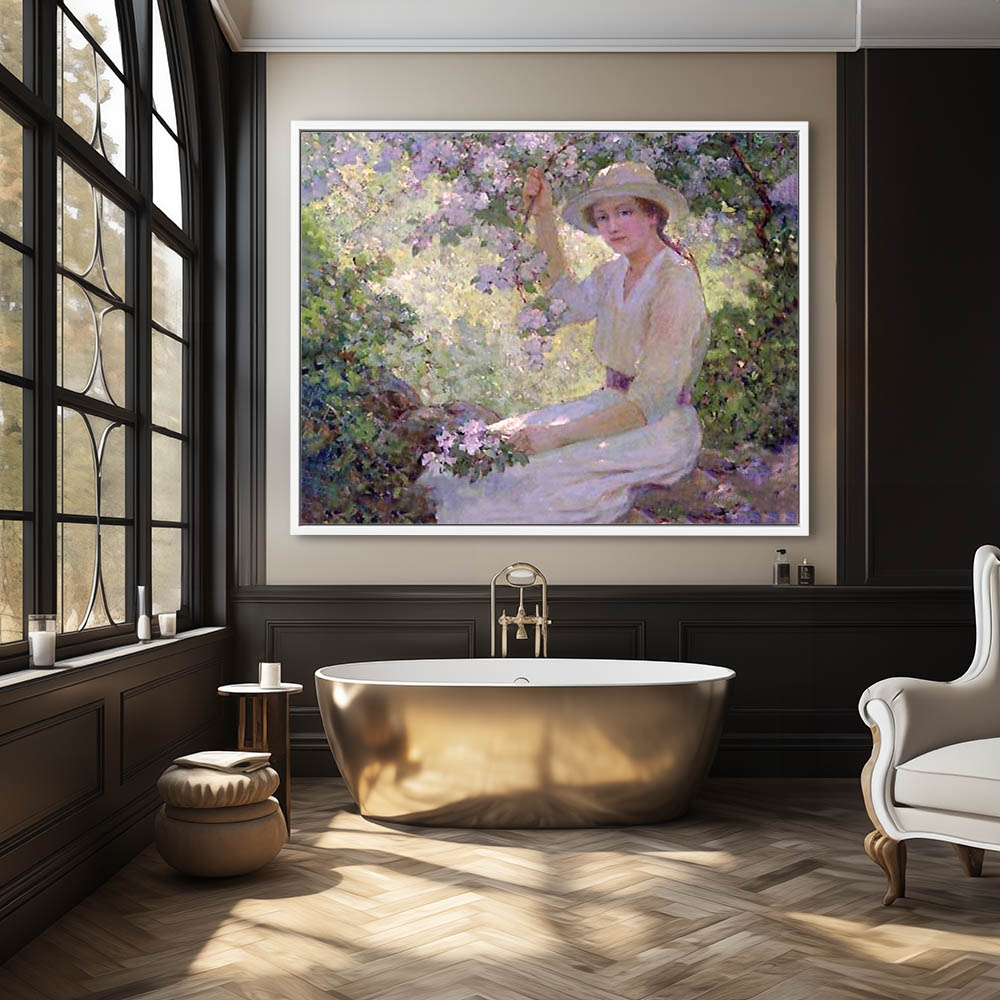 Vintage Figurative Painting with a Woman Sitting under the Apple Blossoms