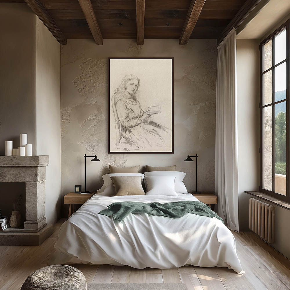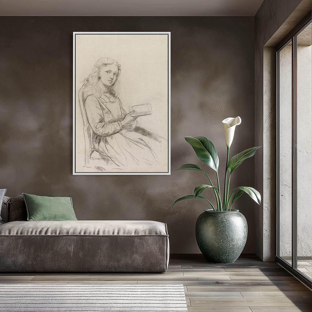 Portrait drawing of a young girl, seated with a book in her hand