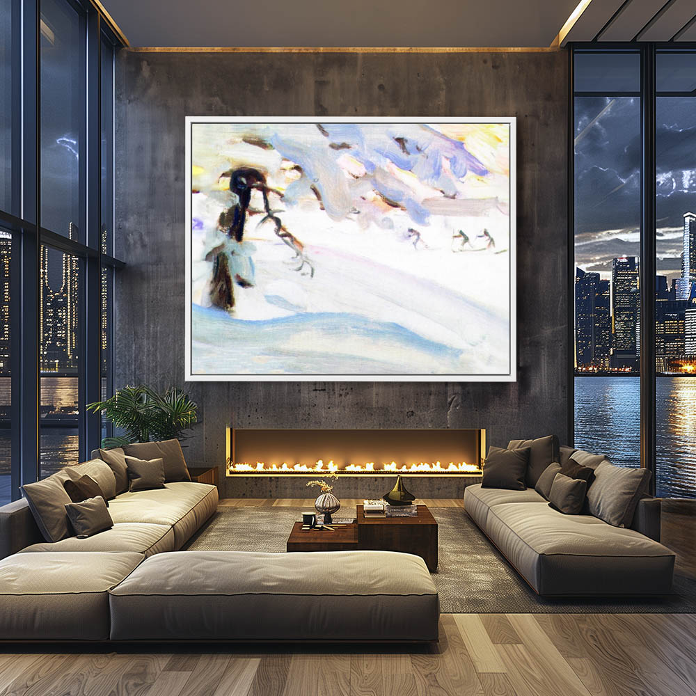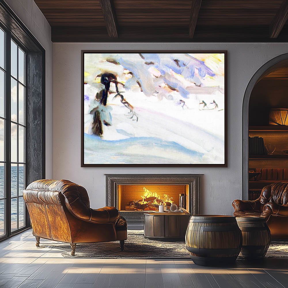 Landscape Painting in Winter with Snow and Snow Skiiers