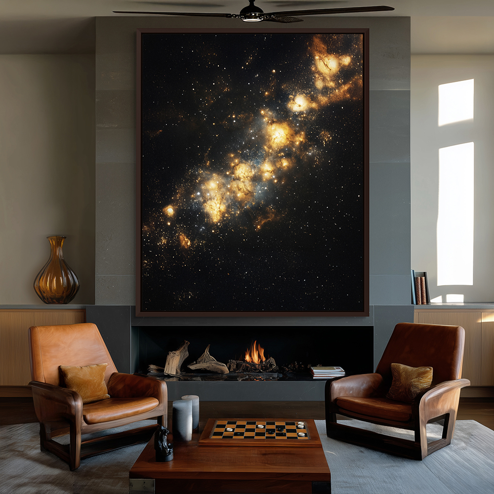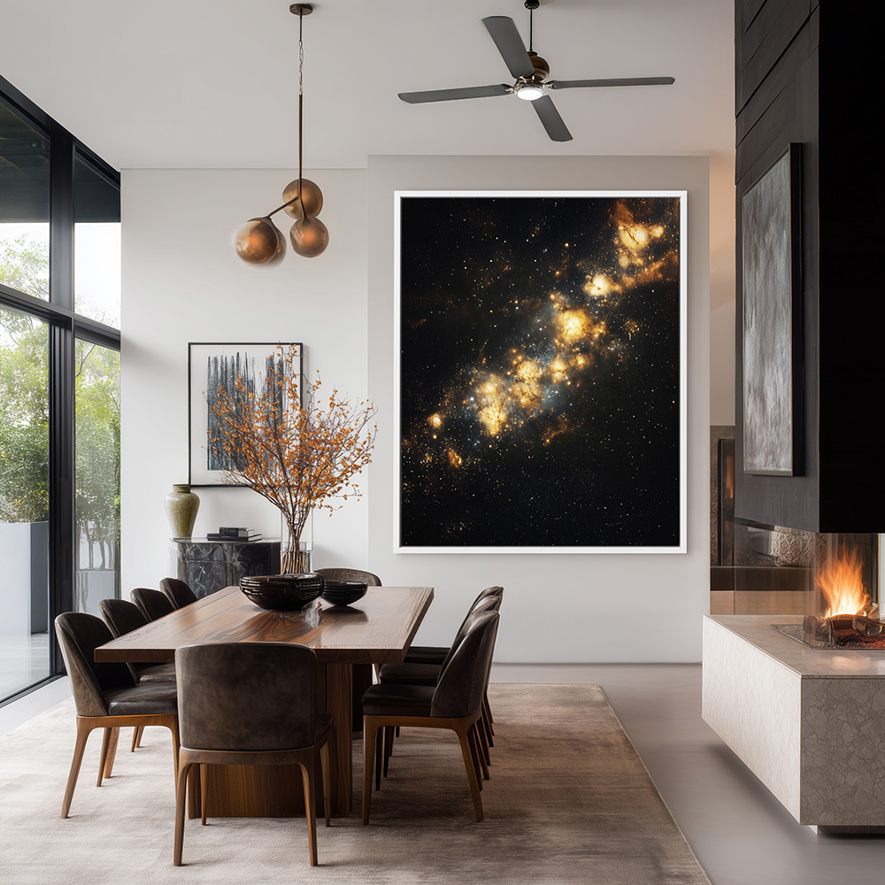 Space Galaxy Cosmos: Home decor wall art featuring a stunning star system in the vast expanse of outer space. Choose from a wide variety of sizes and formats, including metal wall art, metal prints, vinyl wall art, vinyl prints, peel-and-stick vinyl, vinyl wall art, vinyl wall peel, framed wall art, framed prints, fine art prints, poster art, poster wall art, poster prints, stretched canvas, stretched canvas wall art, and framed canvas wall art with floater frames. Available frame colors include black, white, and brown, offering options to match any style.