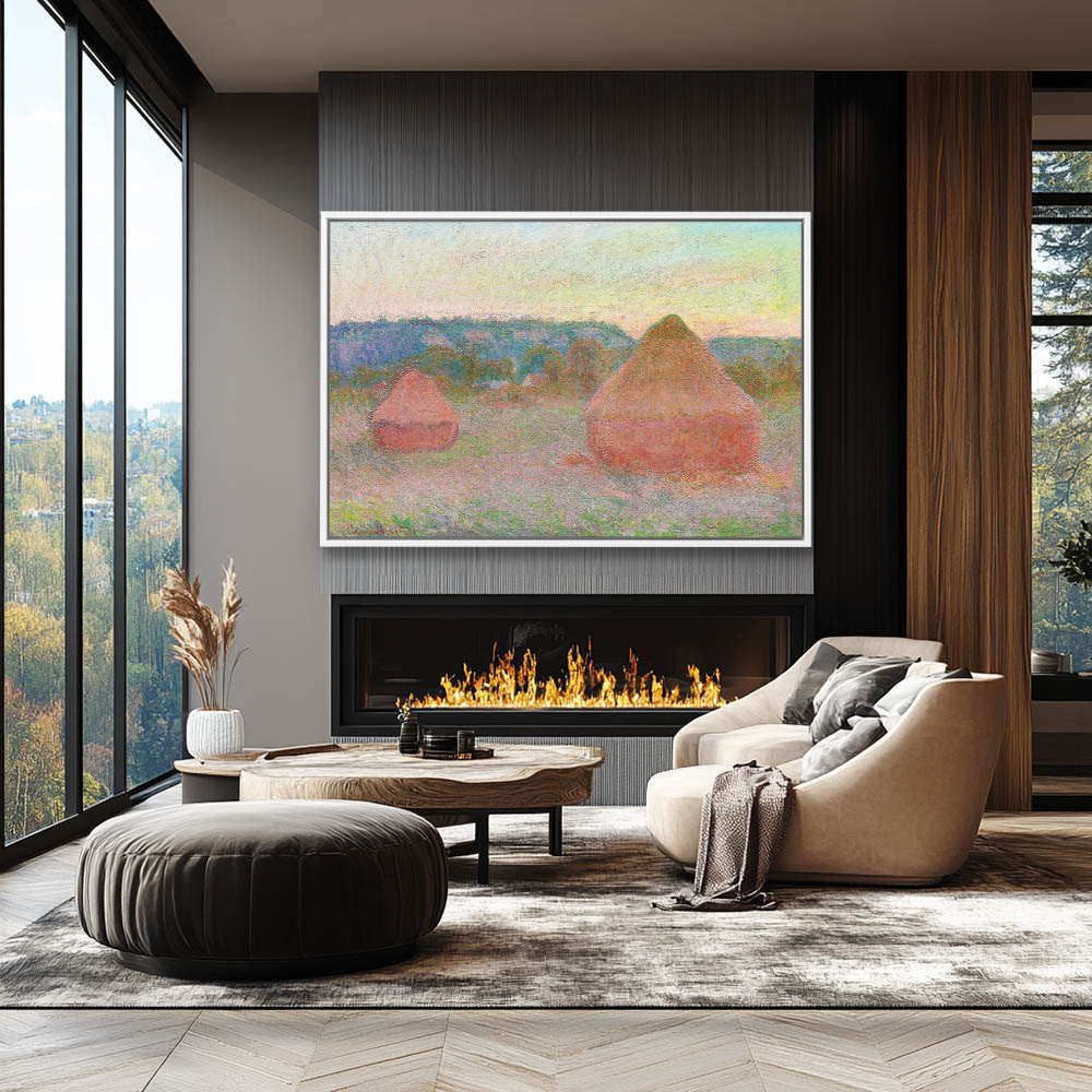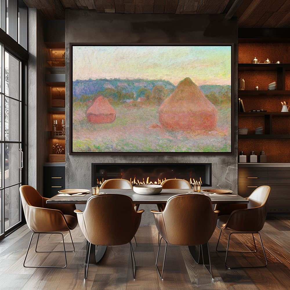 Vintage Landscape Painting with a Wheat Grainstack at Sunset in Autumn