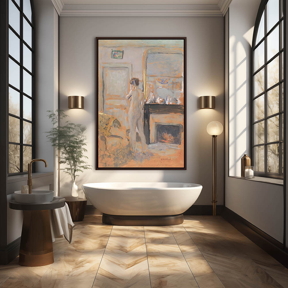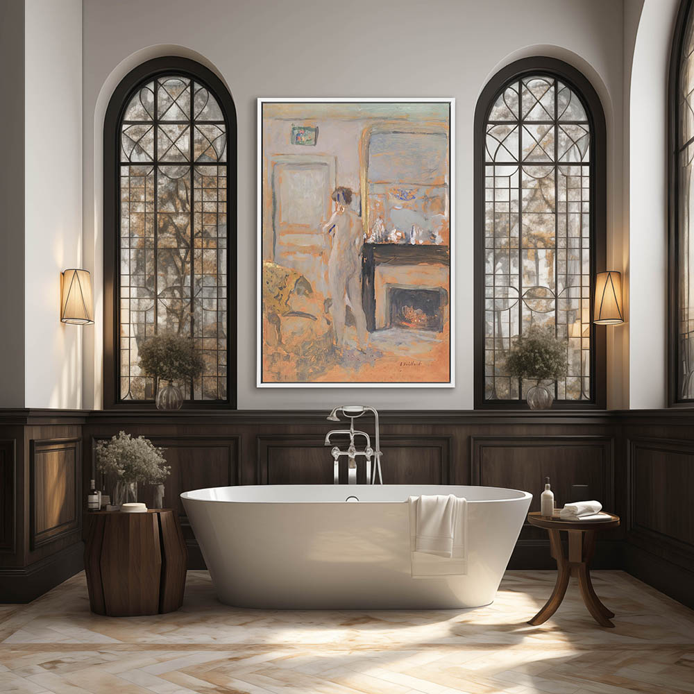 Female nude from behind standing by the fireplace