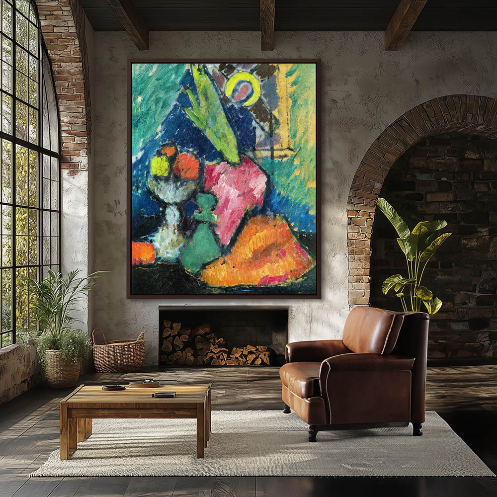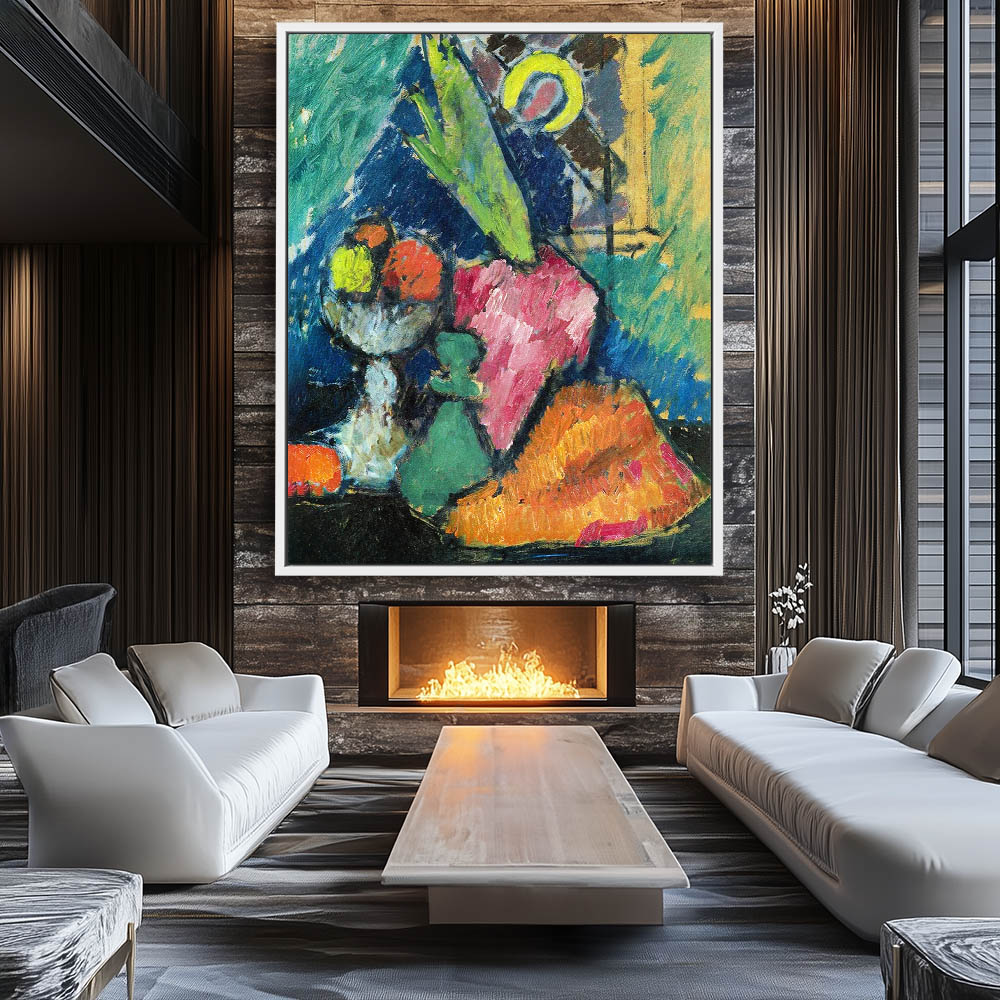 Abstract Still Life Painting with Bowl of Fruit a Pot of Flowers and Figurine