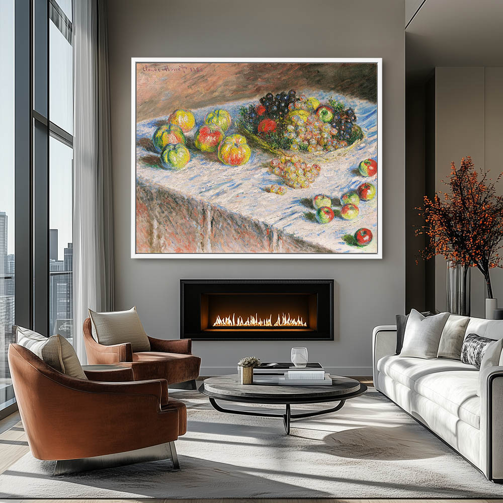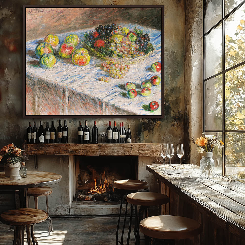 Vintage Still Life Painting with Apples and Grapes on a Table