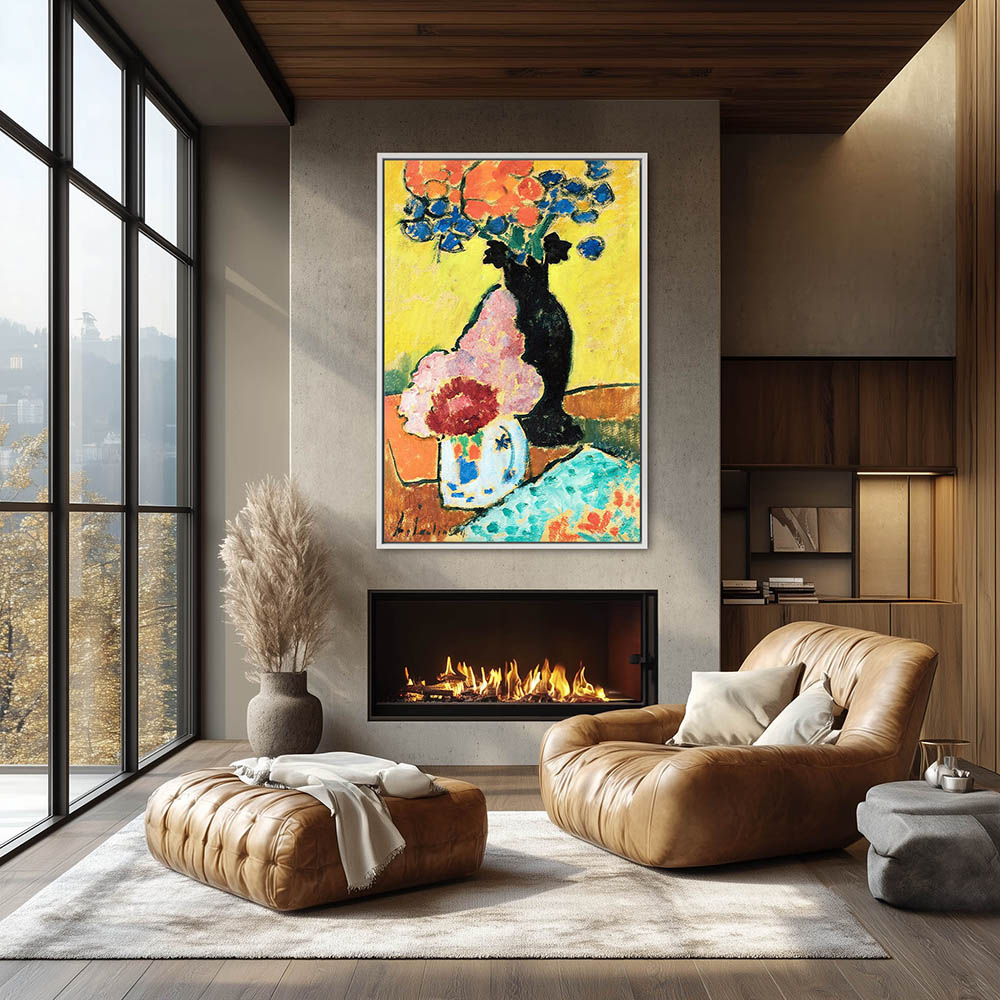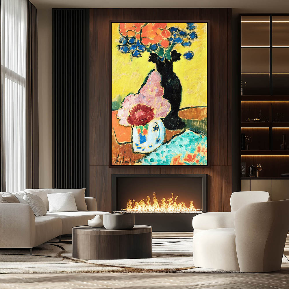 Abstract Still Life Painting with Flowers and Black Vase on Yellow Background