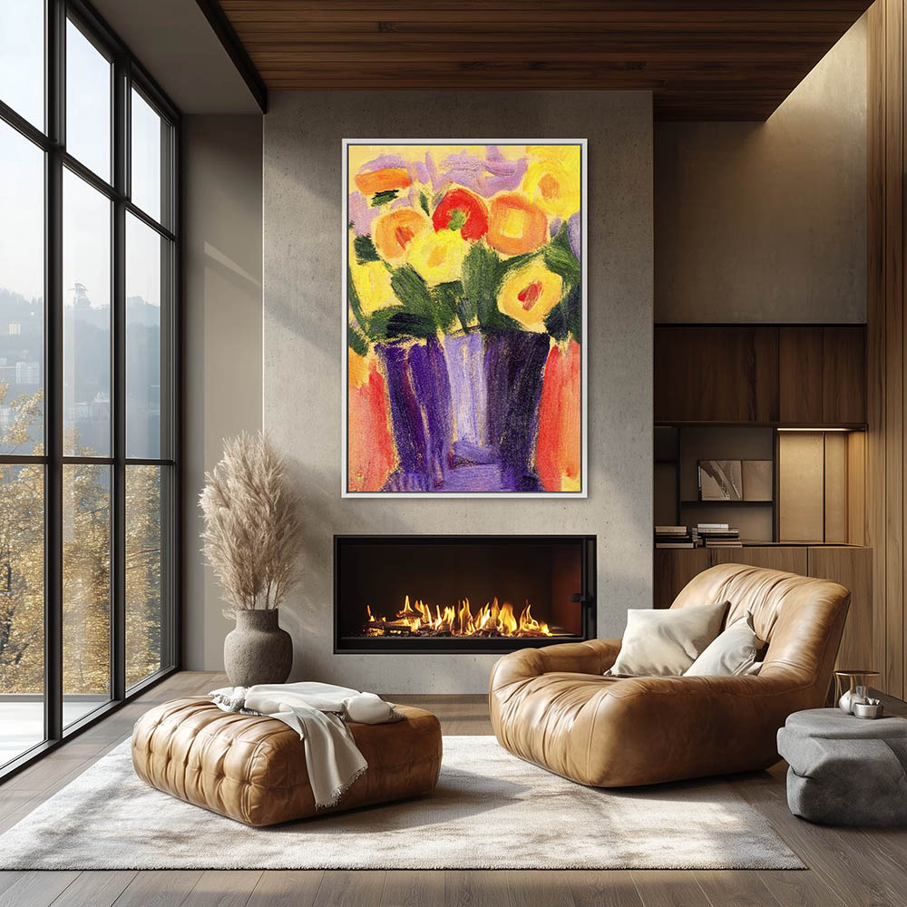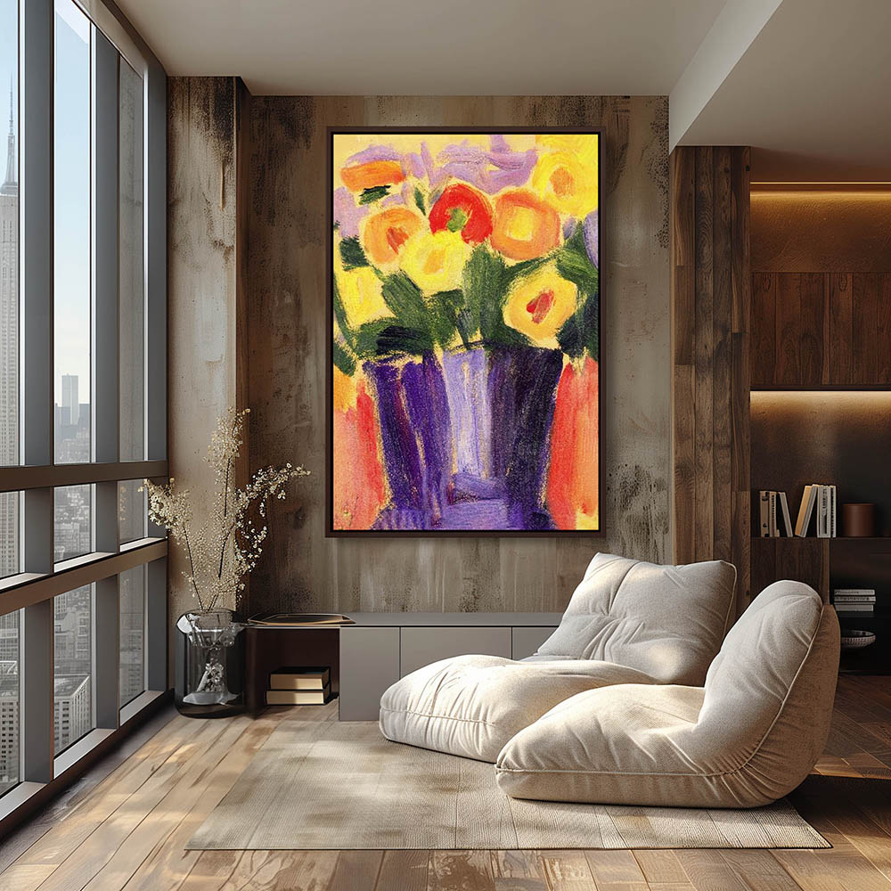 Abstract Still Life Painting with Flowers in a Purple Vase