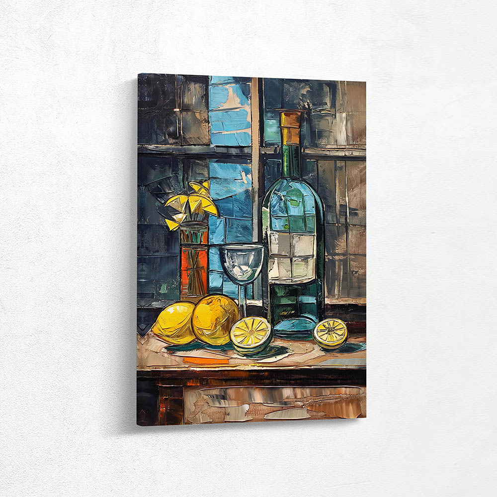 Still life with lemons, a knife, a bottle and glass on a table in front of a window