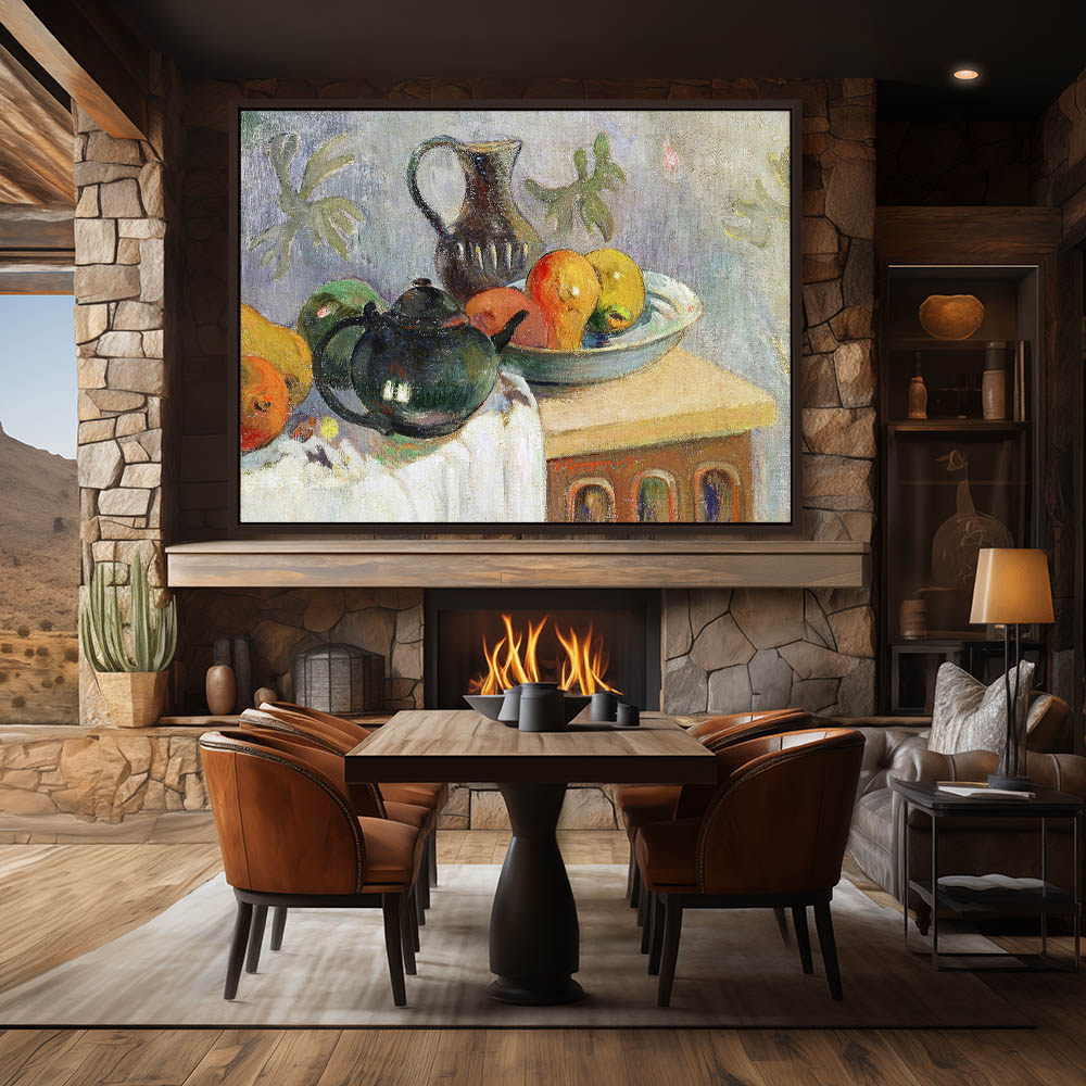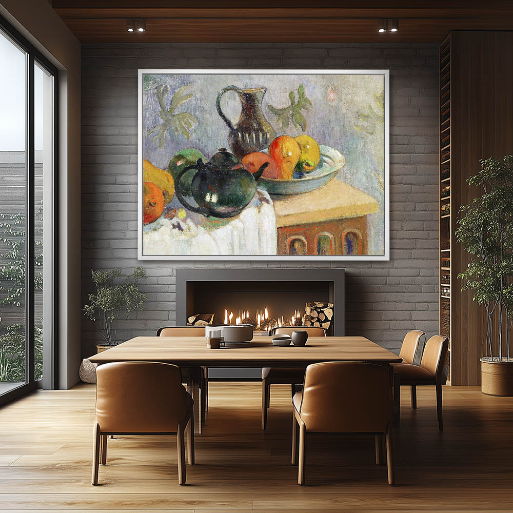 Vintage Still Life Painting with Fruit and a Teapot