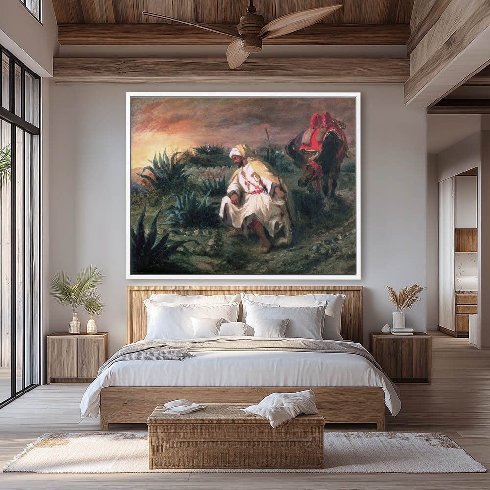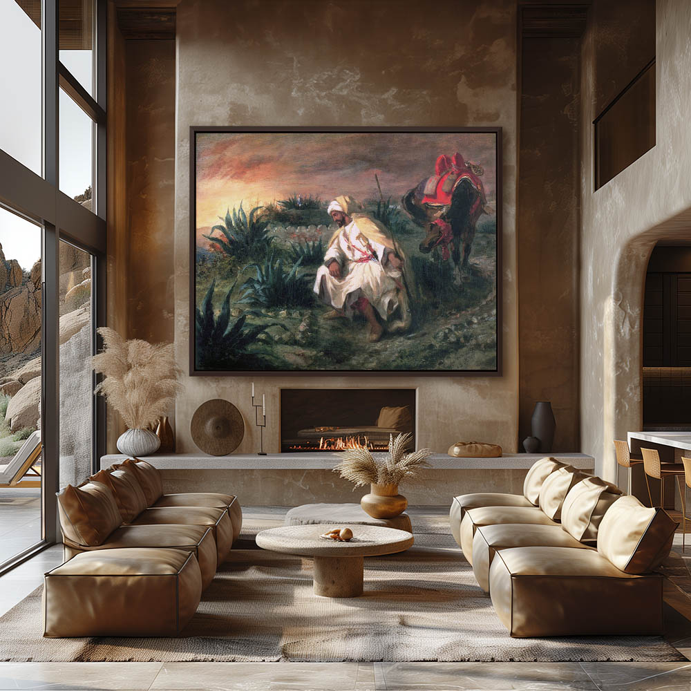 Vintage Figurative Painting with a Horse and Rider at the Tomb at Sunset