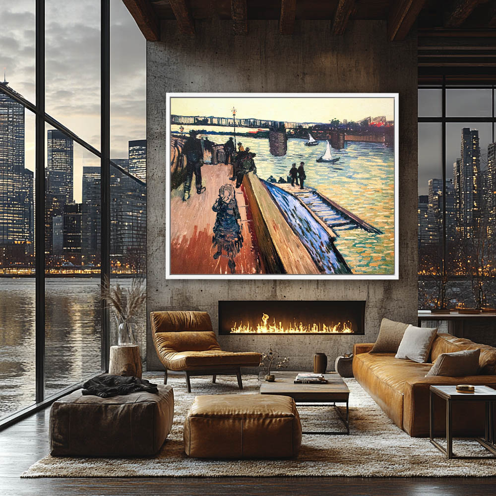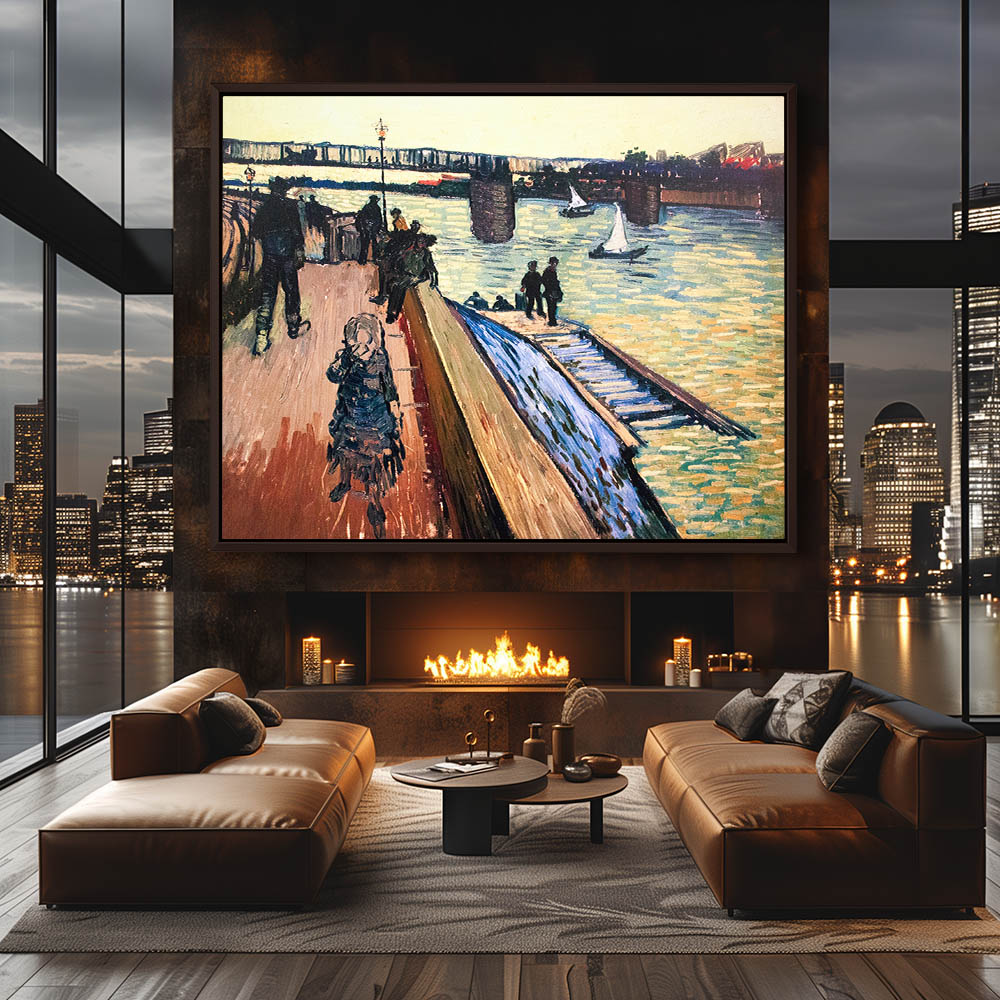 Impressionist Abstract Painting Bridge over the River with Figures and Sailboats