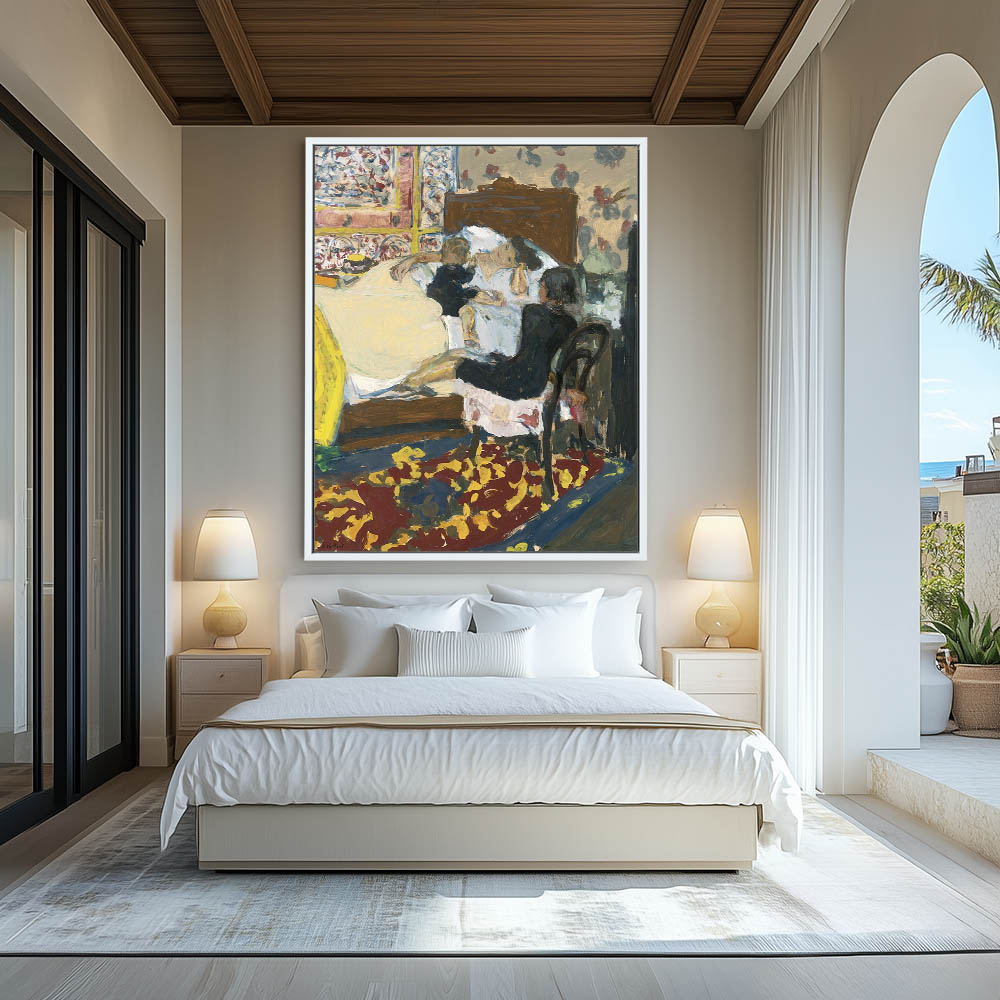Woman in bed with two children beside and on the bed. Floral patterns adorn the carpets, wallpaper and wall hangings.
