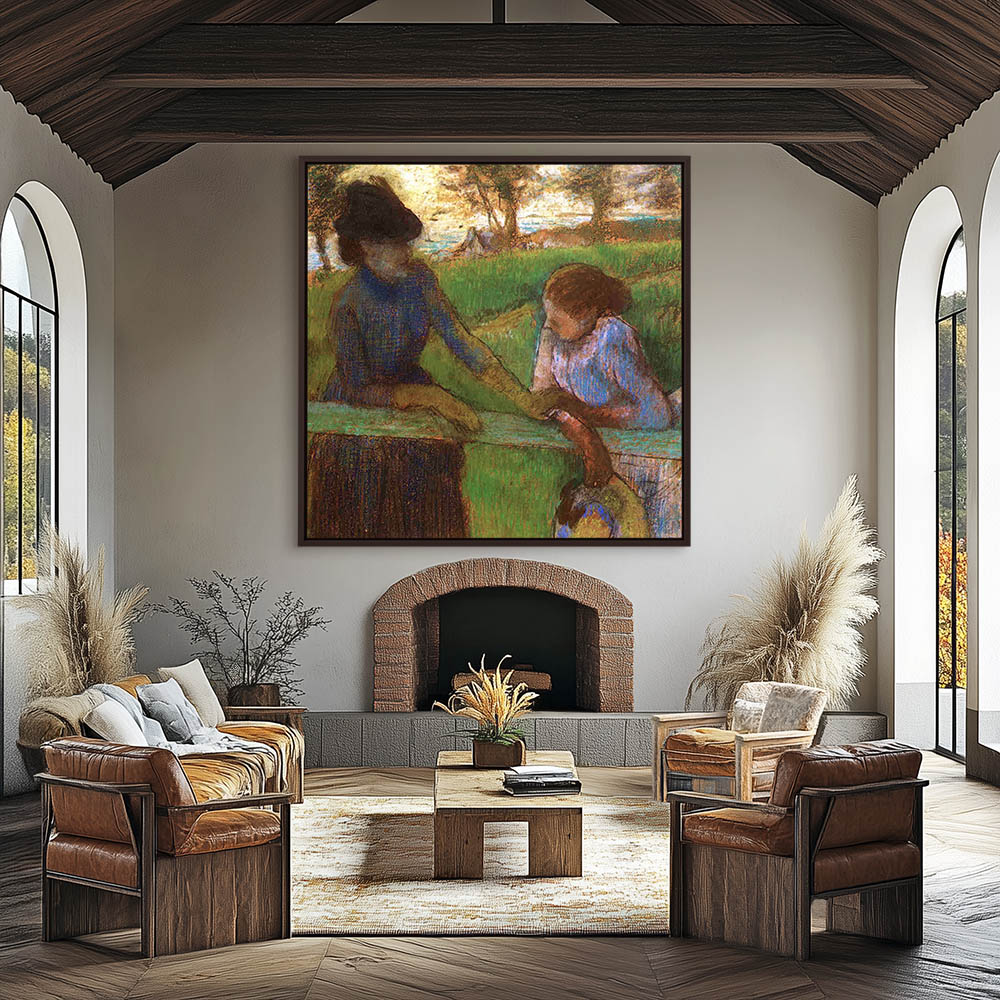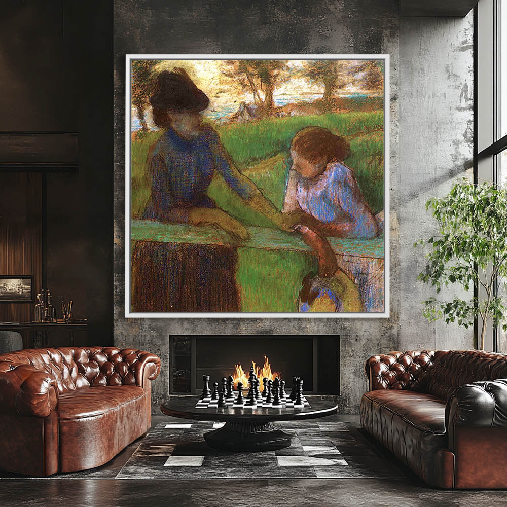 Woman and a young girl lean forward against a fence in conversation, the young girl with her hat in hand and the woman with her hand resing on the the girls arm.