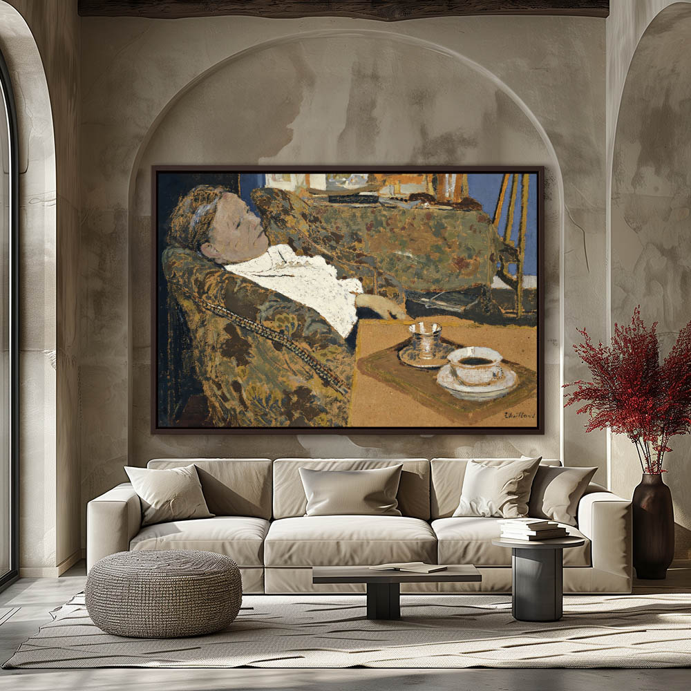 Woman lounging in floral print armchair with a coffee cup on a tray on a side table