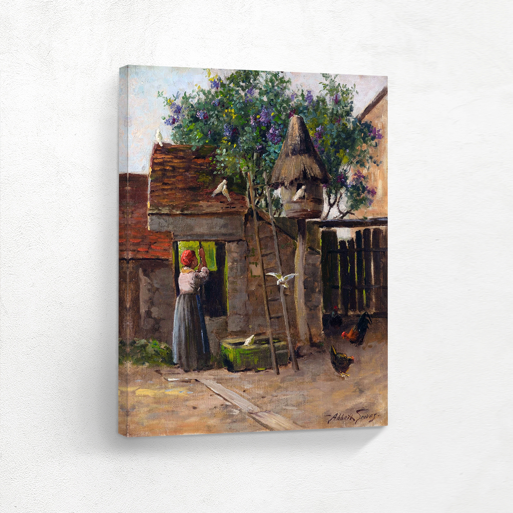 Vintage Farm Landscape Painting with a Woman Drawing Water from the Well