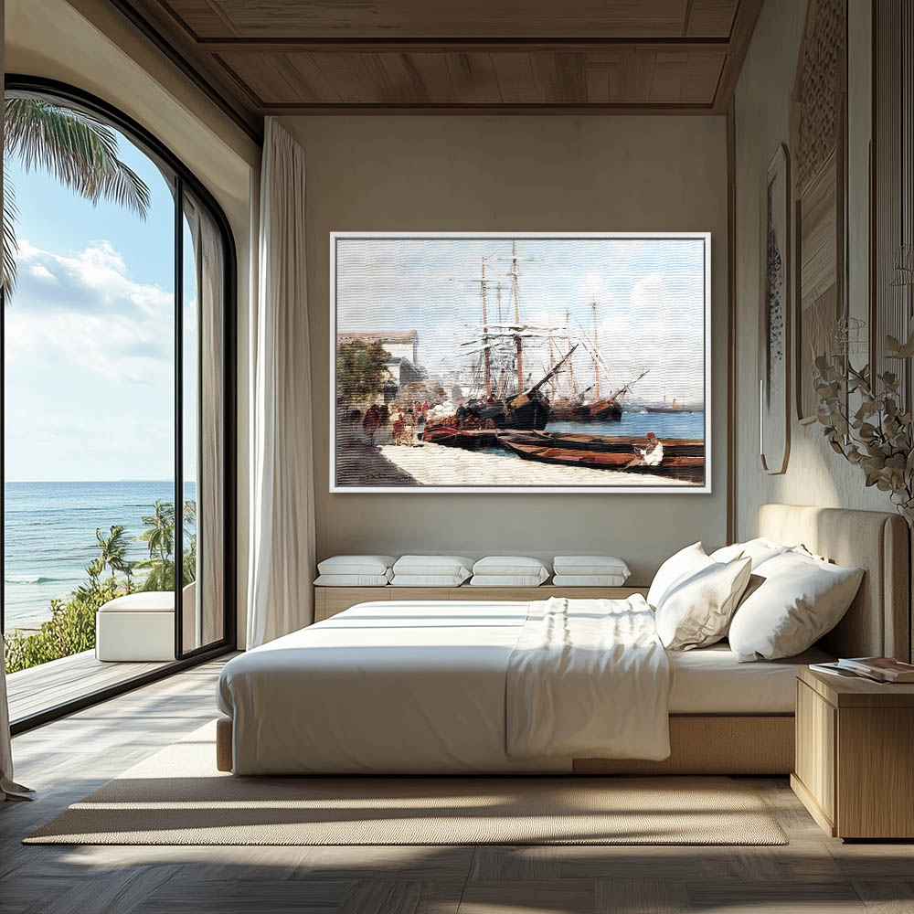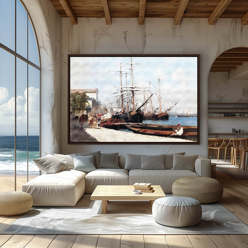 Coastal Harbor Painting with Ships at Harbor