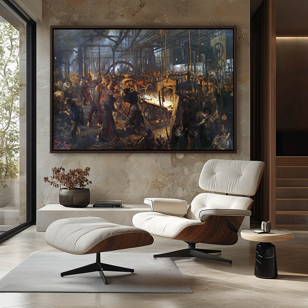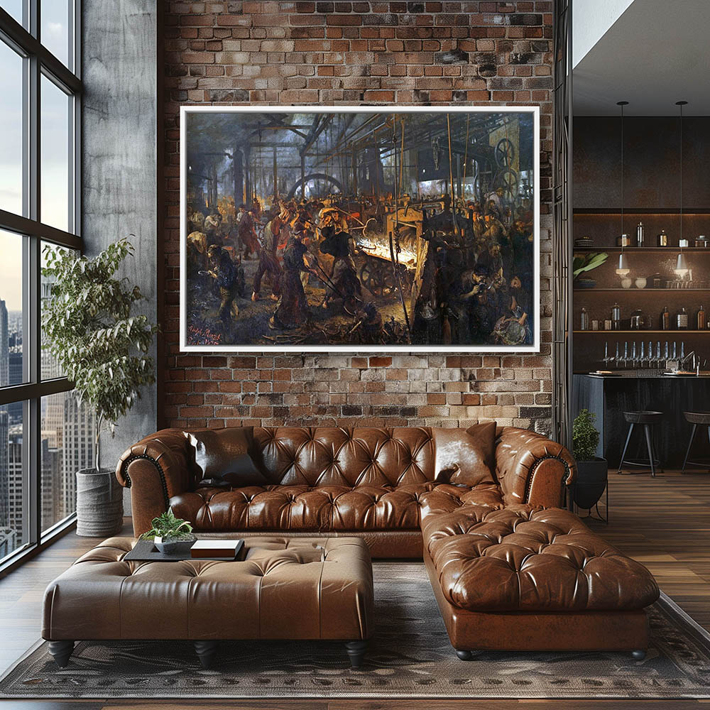 Vintage Industrial Painting with Workers in The Old Iron Rolling Mill